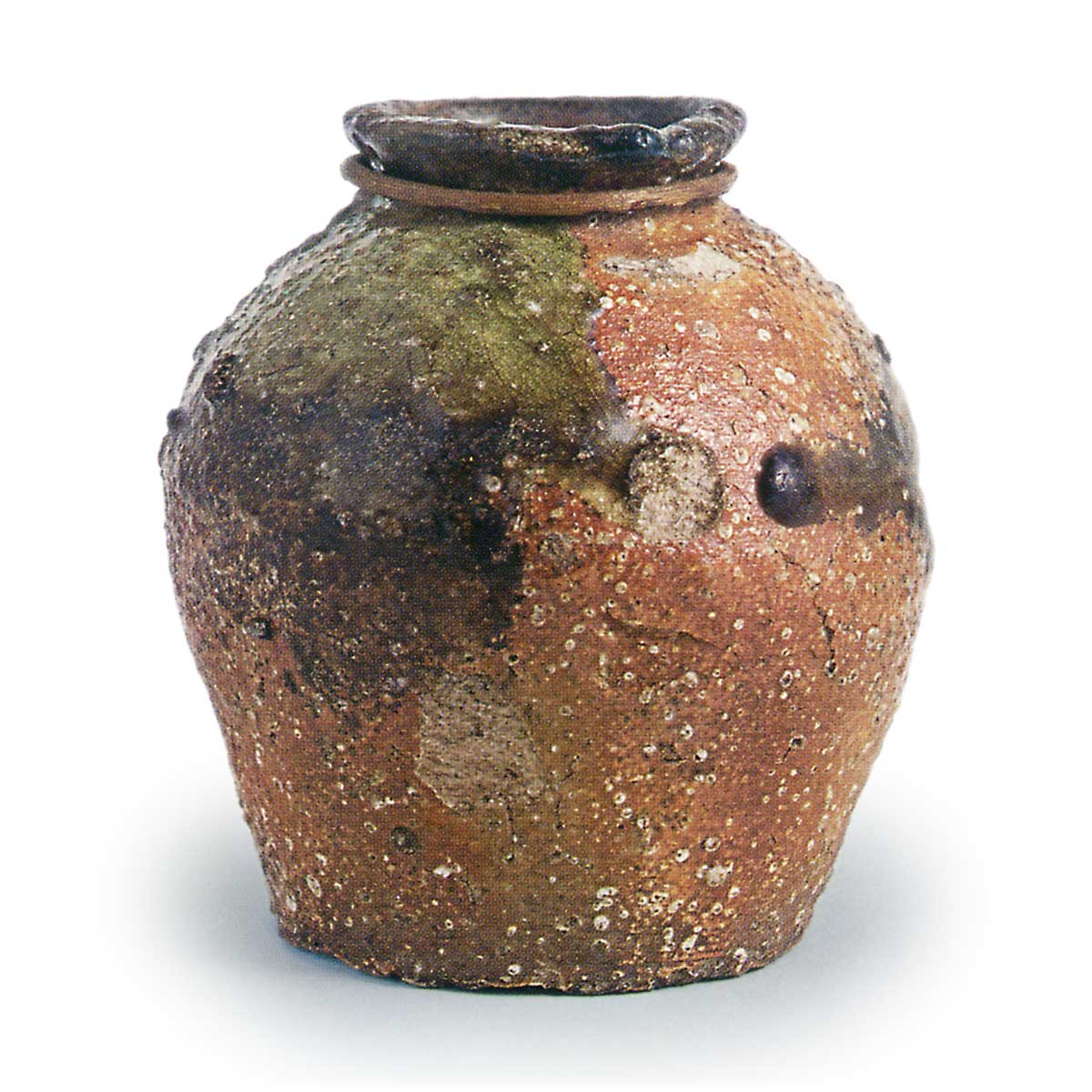 伊賀片口小壺 信楽備前丹波伊賀片口小壺 2025.06.12 伊賀片口小壺 16世纪高度14.7厘米,口径7.0厘米,胴径13.9厘米,底径9.5厘米伊贺信乐古陶馆该器为短而弯曲的口颈部向外反卷的片口小壶,其特色在于肩部圆润、底部宽大、整体造型敦实。陶土中长石溶解充分,气泡较多,肩部自然釉色澄澈,呈现浓郁的绿色,或许可归入信乐陶器的范畴。