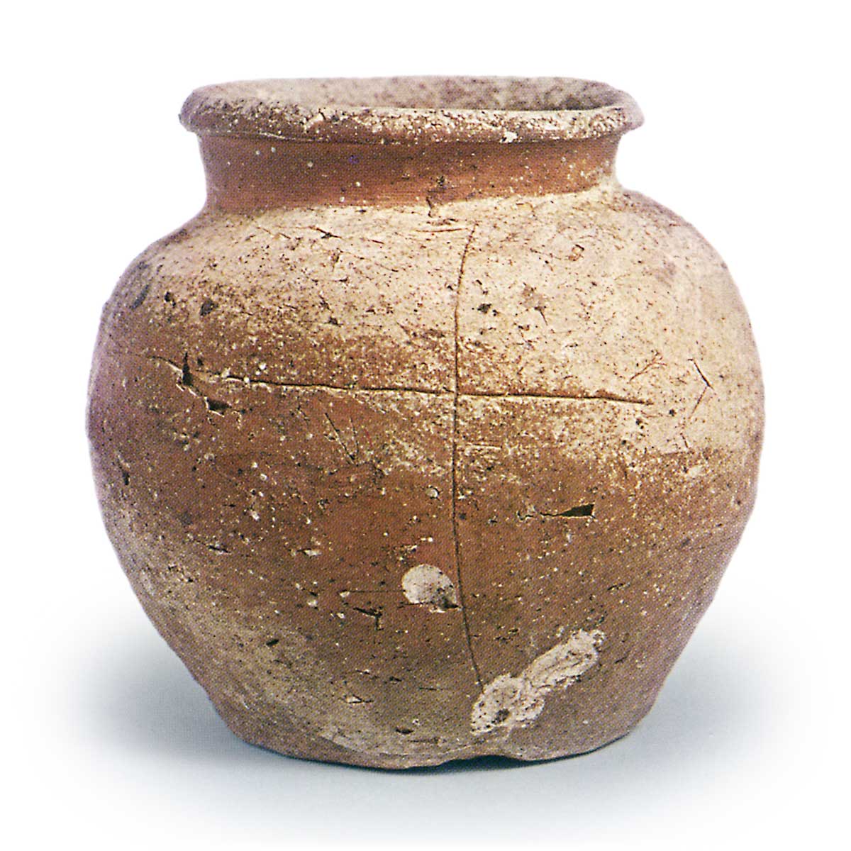 伊賀小壺 信楽備前丹波伊賀小壺 2025.06.12 伊賀小壺 高度15.0厘米 口径10.8厘米 胴径15.4厘米 底径9.7厘米将短口颈的末端折回,形成圆润的口缘。胴体呈球形,与图69的小壶属于同一类型的壶。陶土以长石细粒为主,含铁量不高,烧制后致密坚实,呈现茶褐色。口沿至肩部自然釉色呈白色,展现出伊贺陶器常见的色调。壶身中央有十道明显的线刻纹饰。