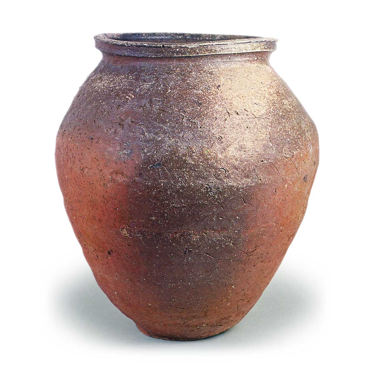 推测为14世纪中叶的作品。茶褐色烧成,肩部自然釉呈白芝麻状,这也是伊贺的特色。底部有下駄印。