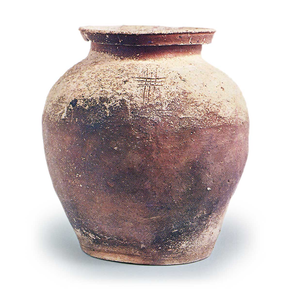 伊賀甕 信楽備前丹波伊賀甕 2025.06.12 伊賀甕 15世纪高度28.6厘米,口径17.3厘米,胴径26.6厘米,底径16.7厘米口沿向外折叠并上下延伸,形成宽阔的边缘带,充分展现了伊贺·信乐的特色。从肩部较短且与口部连接较为缓和的状态来看,推测为15世纪初期的作品。采用含有长石微粒的细密陶土,烧制后质地坚实,呈现茶褐色,口部及肩部覆盖的自然釉呈白濁状。肩部有窑印。