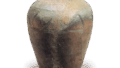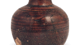 备前烧开始展现其独特的红褐色火色是在镰仓时代后期。此时还仍在烧制还原烧成陶器,其中也有灰色作品,因此仅凭火色无法确定年代。此壶口颈短而直立,口径与底径几乎相等,肩部呈圆润下垂的形态,因此被认为是镰仓时代后期的作品。其造型采用绳纹装饰的较薄胎体,烧成温度较高,产生了显著的烧歪现象。肩部刻有三条平行凹线,其间夹有两枚重叠的椭圆形刻纹。壶身部分残有其他器物的圆形粘附痕迹,其外周呈现黑色炭化景象。口缘至壶身部分覆盖有白色浑浊的自然釉。目前口缘至肩部有较大破损缺失,但器面溢出的火色发色在古式沉线纹壶中最为优异,堪称镰仓后期代表性作品之一。