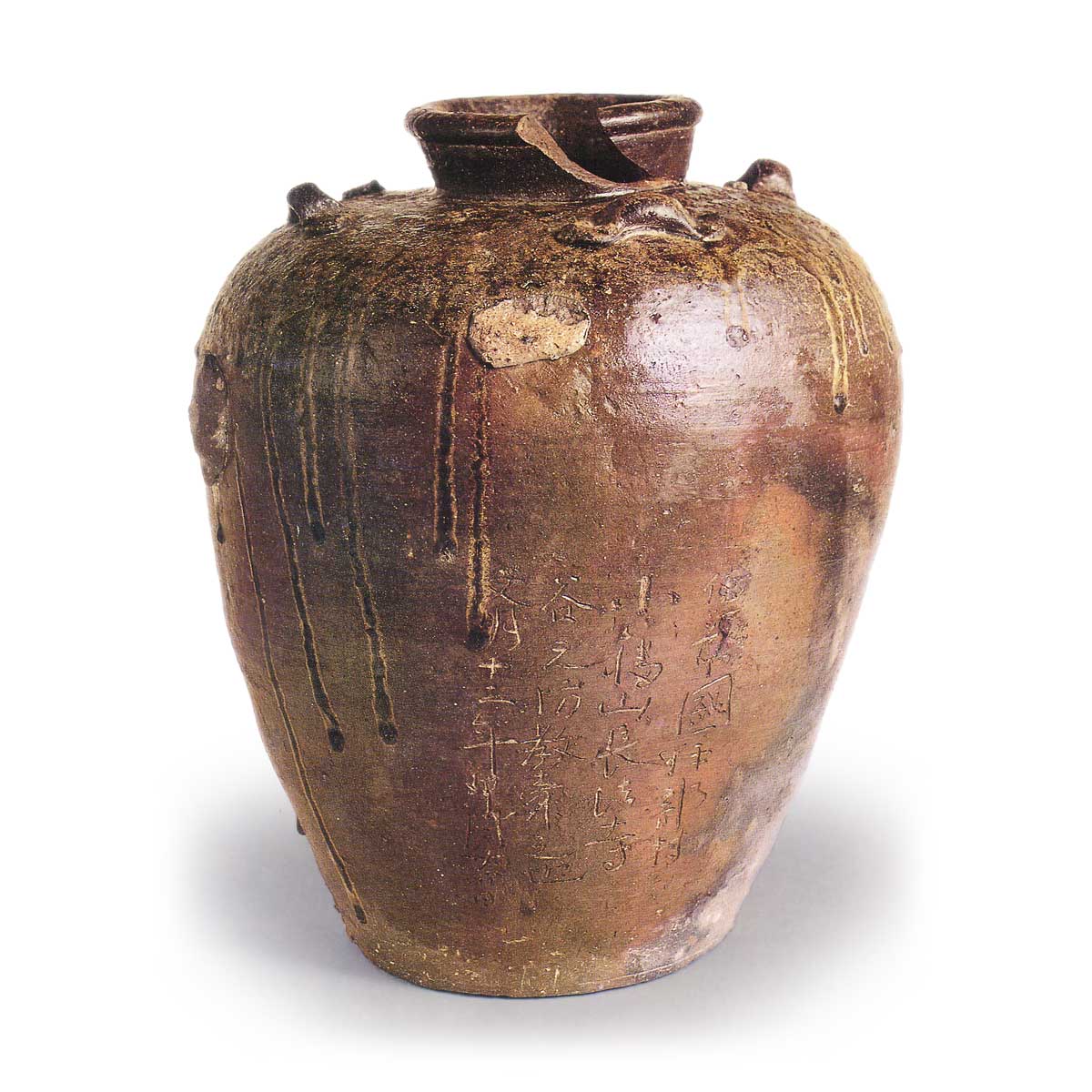 口颈部略微外张,这是由于高温烧制导致开裂并扩散所致。此时期的口颈部通常直立,玉缘退化并趋于扁平。肩部隆起,胴体下半部逐渐收窄也是这一时期的显著特征。以宽4厘米的泥条压展后卷起成型,器面采用快速轮盘旋转调整。器身下半部刻有四行铭文:“备前国伊部村小幡山长法寺谷之坊教舜之也文明十二年卯月廿四日”。器物烧制极为紧密,呈现茶褐色,肩部覆盖的暗绿色自然釉流至胴下半部,尖端处釉料聚集形成珠状凸起。这是室町中期的一件精品。