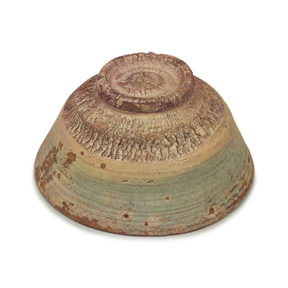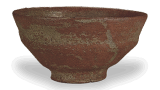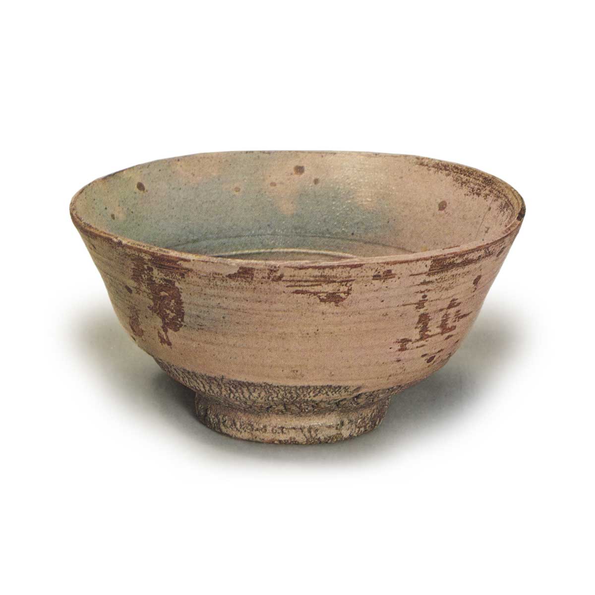 淡枇杷色中带有一丝青色,火替部分如朦胧的霞光,这便是此铭的特色。即便在斗々屋的本手作品中,也可称得上是稀世名品。高台周围的制作手法极为精湛,堪称无与伦比,而上半部分的洒脱风格更是压倒群雄的杰作。总体而言,其高雅气质堪称本手中的白眉之作。上半部分采用薄手造形,边缘处有切回处理,轆轤纹路柔和流畅,釉面薄而均匀,局部略带斑驳。整体呈现淡枇杷色调,内外部均可见优雅的青色火替。口径宽阔,周边有两道清晰的纹路,眼部有六处。高台部分更是亮点,两侧有两道激烈的侧面处理,素地粗犷地削去,壮烈得令人屏息,竹节高台雄伟,内侧有锐利的兜巾状纹路,涡纹鲜明,绉纹也极为精美。