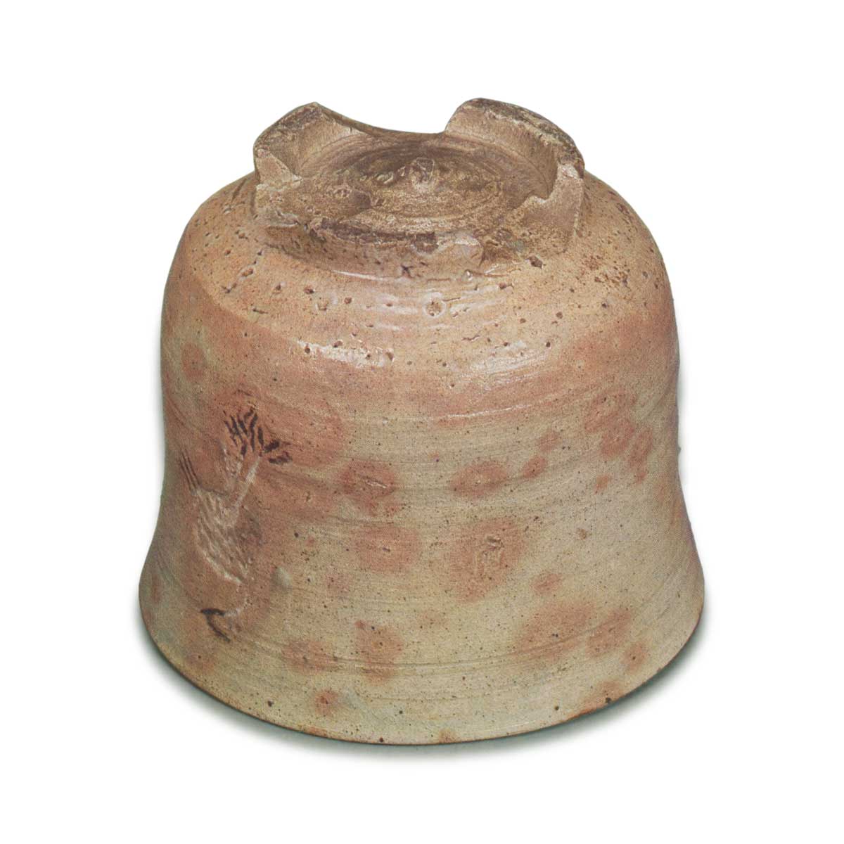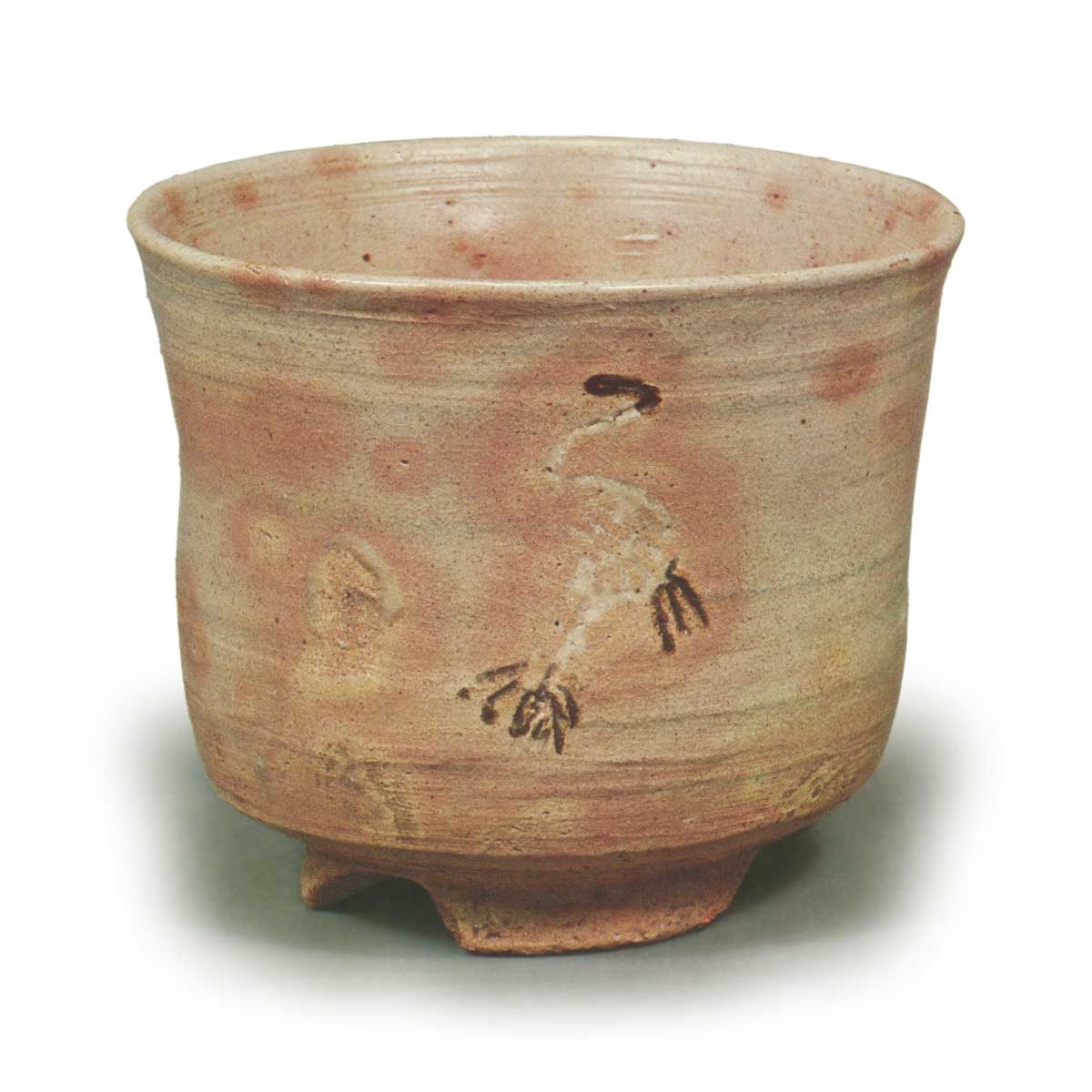 本手立鹤较为稀少,其中这件是名古屋十一屋传来的,被认为是本手中的佼佼者。器形薄筒状,口沿微微外翻,胴部可见轆轤痕迹,略显紧凑,变化丰富。整体略带青色的淡柿色釉面,鹿子纹与火替纹美丽,胴前后有立鹤的压花,形成黑白象嵌。见地处鹿子纹遍布,火间景致优美。高台为三裂式,兜巾立,侧边线条柔和。