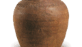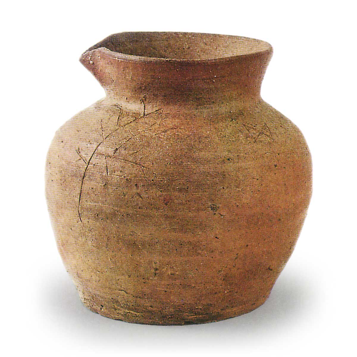 备前刻文片口小壶 信楽備前丹波备前刻文片口小壶 2025.06.29 备前刻文片口小壶 备前烧:刻纹片口小壶。14世纪。高17.5厘米。14世纪高17.5厘米,口径12.2厘米,胴径17.9厘米,底径12.3~12.8厘米早期的大型片口壶在室町时代中期以后逐渐演变为小型圆形壶。壶身愈发缩小,口颈部延长,呈喇叭状开口。这可视为过渡形态的典型代表。采用绳土卷起、削制成型,器壁薄透。烧成坚实,略带火色。肩部以锐利的篾纹装饰,绘有树纹,其旁刻有窑印。