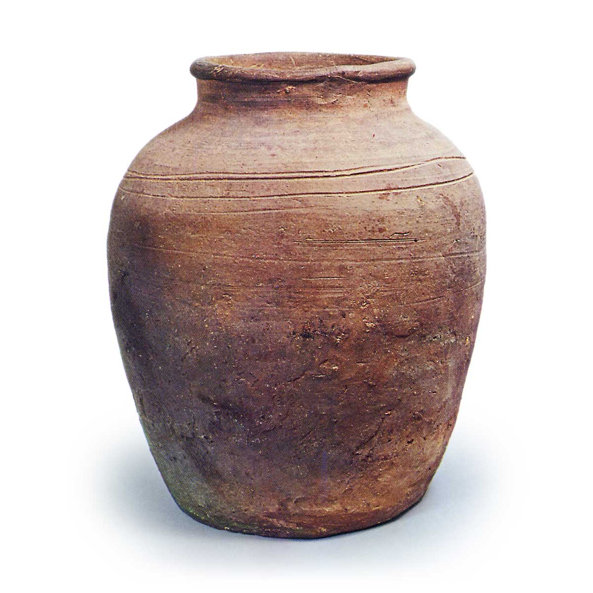 备前 沉线纹壶 信楽備前丹波备前 沉线纹壶 2025.06.29 备前 沉线纹壶 广岛县福山市草户千轩遗址出土13世纪高度35.0厘米 口径14.0~14.8厘米 胴径29.0厘米 底径18.3厘米口颈部略细,垂直耸立,口缘端向外折返,已形成玉缘。采用绳土卷起成型,器面经箟磨处理。肩部有两条凹线,但处理粗糙,并非完全平行。烧制效果不佳,已开始转向氧化焰烧成,器身下半部及口颈部出现红色火色。