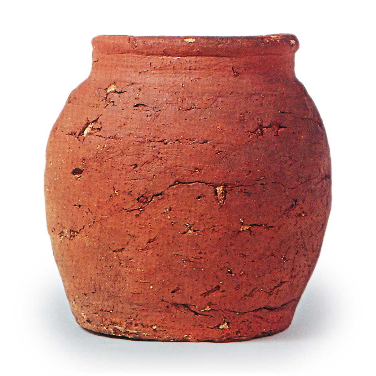 备前 壶 信楽備前丹波备前 壶 2025.06.30 备前 壶 14世纪高度18.1厘米 口径13.1厘米 胴径17.9~18.4厘米 底径13.5厘米冈山县立博物馆这是一个小巧的种子罐,整个表面呈现出红褐色的火色,非常具有备前烧的特色。使用含有大量小石子的粗糙陶土,采用绳土卷起成型法,接缝处出现裂纹,成型粗糙。边缘也有一侧较细, finish 粗糙。烧成不足,接近瓦胎。这是作为最常见的日常杂器制作的典型小壶之一。