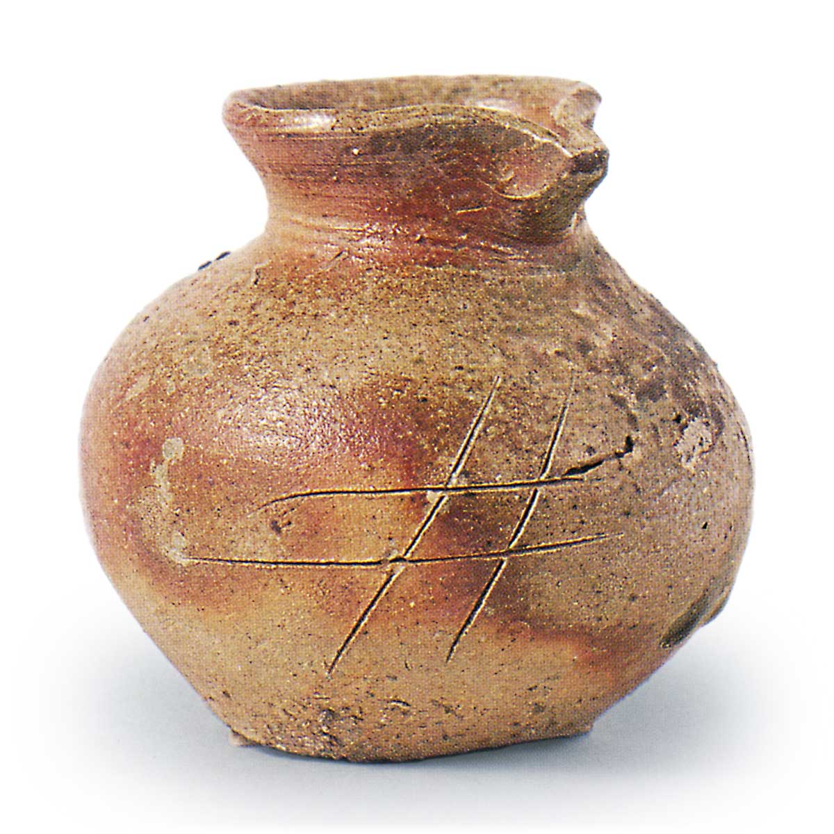 备前 片口小壶 信楽備前丹波备前 片口小壶 2025.07.01 备前 片口小壶 14世纪高度9.8厘米,口径5.5×6.0厘米,胴径9.8厘米,底径5.5厘米胜山町中央公民馆黄白色的底色上浮现出红色火光,堪称令人爱不释手的片口小壶。采用质地细腻、粘性强的陶土,以水拉轆轤成型,底部内侧有线切痕。口沿的片口部分以手指捏制成鸟嘴状。器身刻有碗形箟纹。烧制极为紧密,光泽明亮,肩部至胸部的部分覆盖有黄绿色自然釉,与器身色调和谐统一,增添了明亮感。