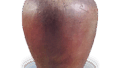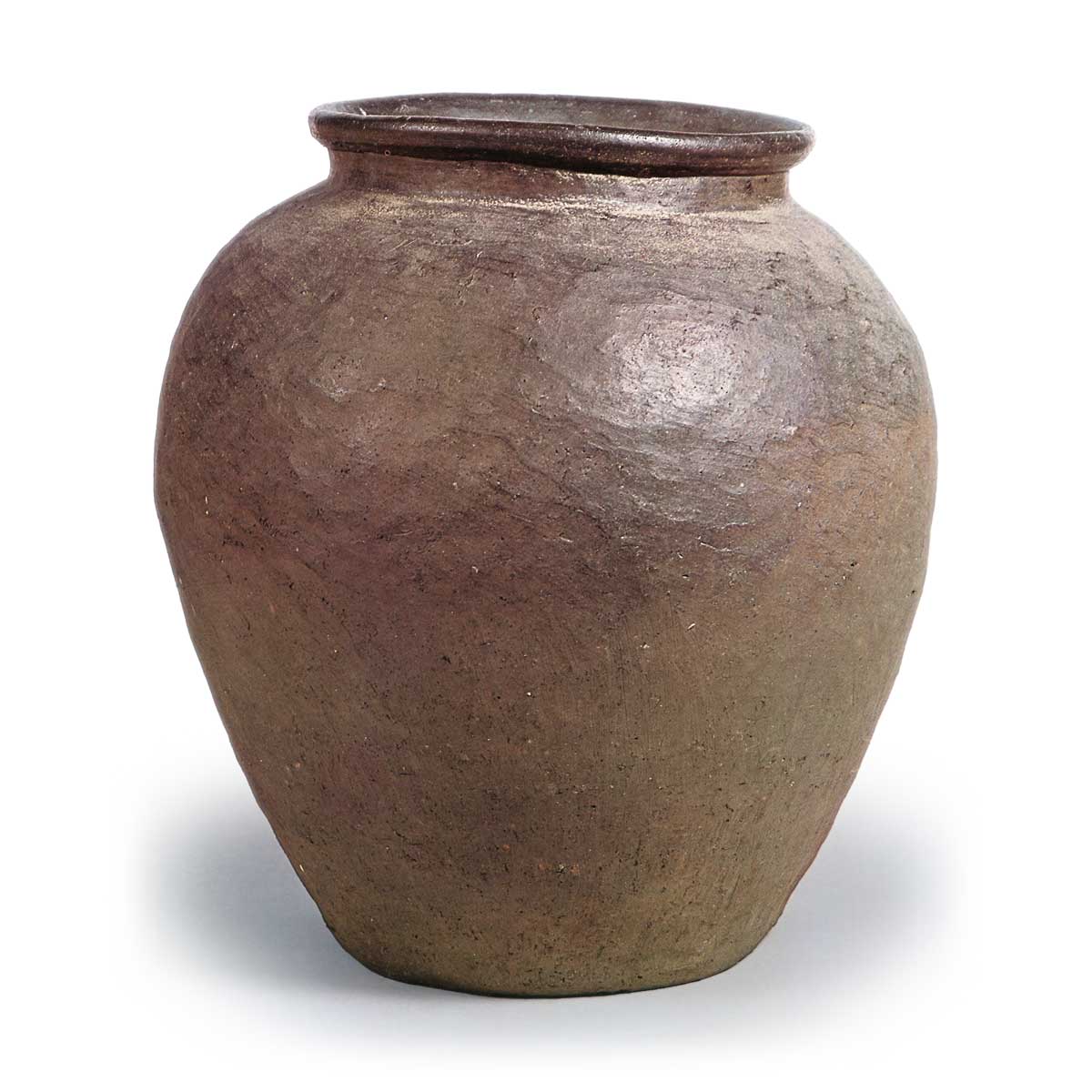 备前 大甕 信楽備前丹波备前 大甕 2025.07.01 备前 大甕 15世纪高度66.0厘米,口径38.8厘米,胴径59.5厘米,底径29.8厘米福山城博物馆口颈部略微延长,口缘的玉缘宽度增大,这可视为较为新颖的趋势。15世纪前半期的作品。采用绳土卷起成型技法,器面经削磨后以刷毛纹调整,表面平滑。烧成略带氧化,烧制效果良好,口颈部至肩部部分覆盖有白色芝麻状的自然釉。