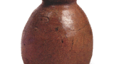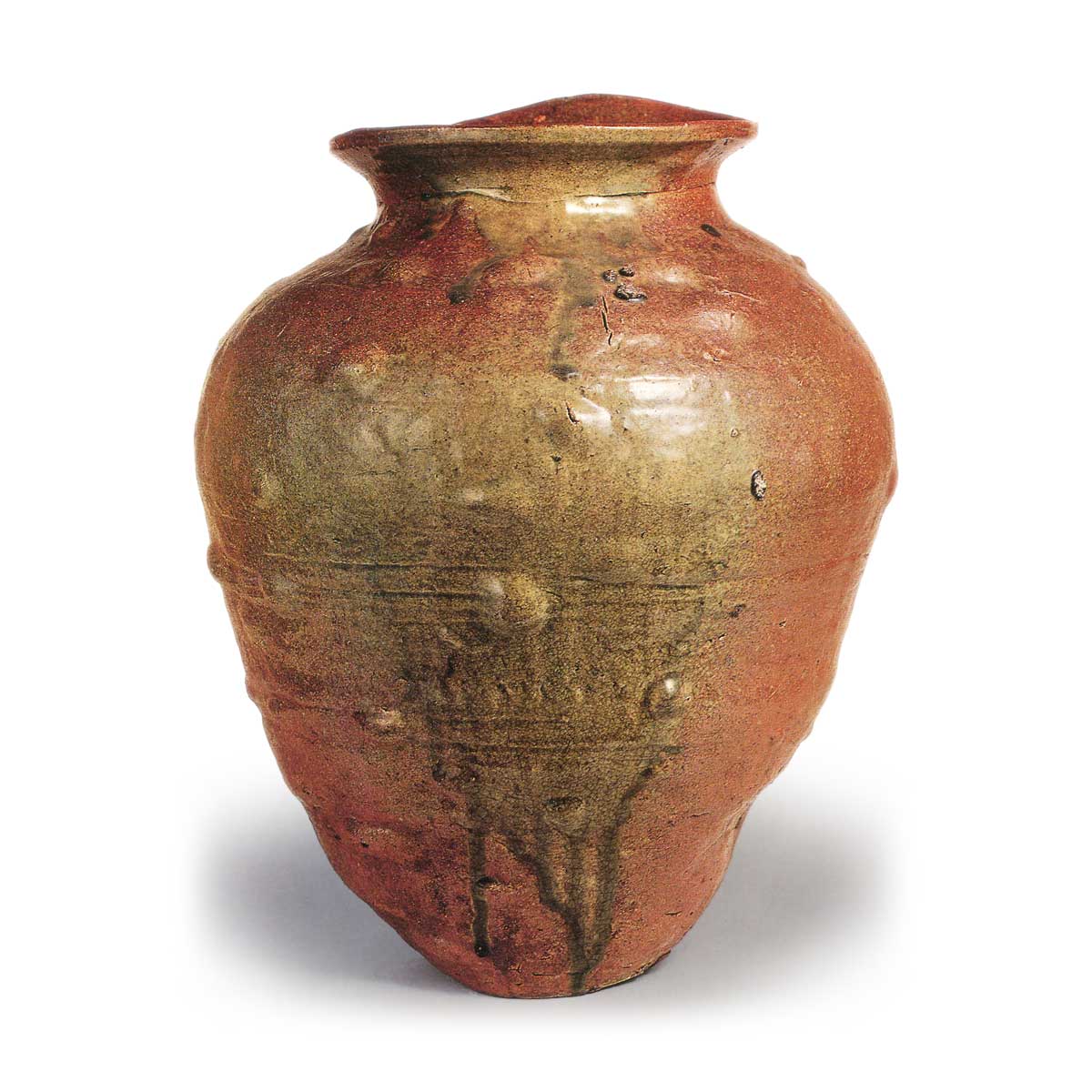 器面烧制极为紧密,呈现红褐色光泽,表面覆盖着鲜绿色的自然釉,釉流至底部附近,使整个大壶更加突出。由于耐火度较低和泥料揉捏不足,整体出现烧制变形,并产生较大的烧制气泡,这虽令人遗憾,但恰恰体现了镰仓时代粗犷的风格,是一件极具时代特色的大壶。