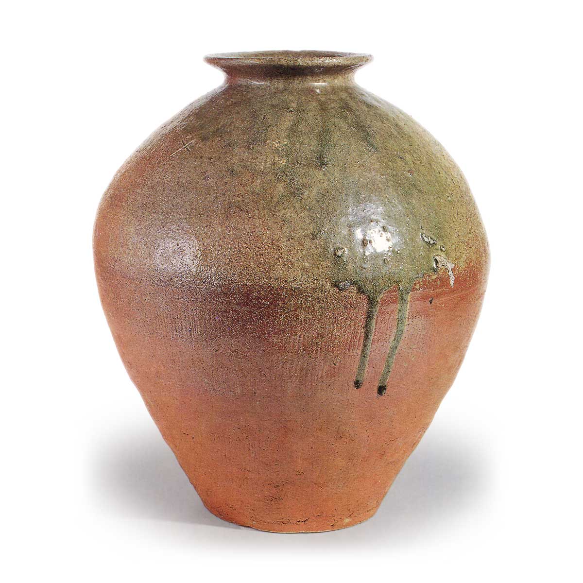 此壶的口部从肩部根部弯曲并大幅外翻,属于刻文壶中常见的圆胴形式壶的流派。此类壶的口部造型不呈玉缘折返式。肩部略呈算盘玉形,躯干形状古朴,但颈部细腻紧凑,并采用纵向梳齿调整器面,运用了所谓的“猫挠手”技法,因此可推断其年代不早于16世纪。素地呈明亮的黄褐色,从肩部流向壶身的自然釉色呈现浓郁的绿色调,这也是该时期的特色。尽管采用绳土成型,但成型技法已有所进步,接缝处处理得当,整体造型端庄。壶身刻有“肩X”窑印。