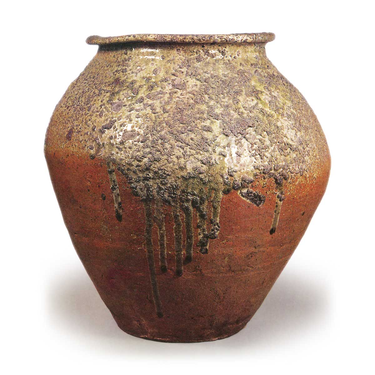 在三本峠和源兵卫山等镰仓时代古窑址出土的瓮的形态与常滑的完全相同。尤其是口缘的形状显示出显著的相似性。然而,到了镰仓末期,常滑风格的瓮已消失,统一为丹波独特的瓮。丹波独特的瓮何时出现尚不明确,但这件瓮应属于丹波独特风格的极早期作品。壶身呈“く”字形大幅弯曲,展现出镰仓后期的风格。然而,口部外翻幅度较大,未折返,形成圆口。胎土选用质地细腻的优质泥土,烧制明亮,肩部全面覆盖淡绿色自然釉,釉料溢出并流淌至壶身下半部。