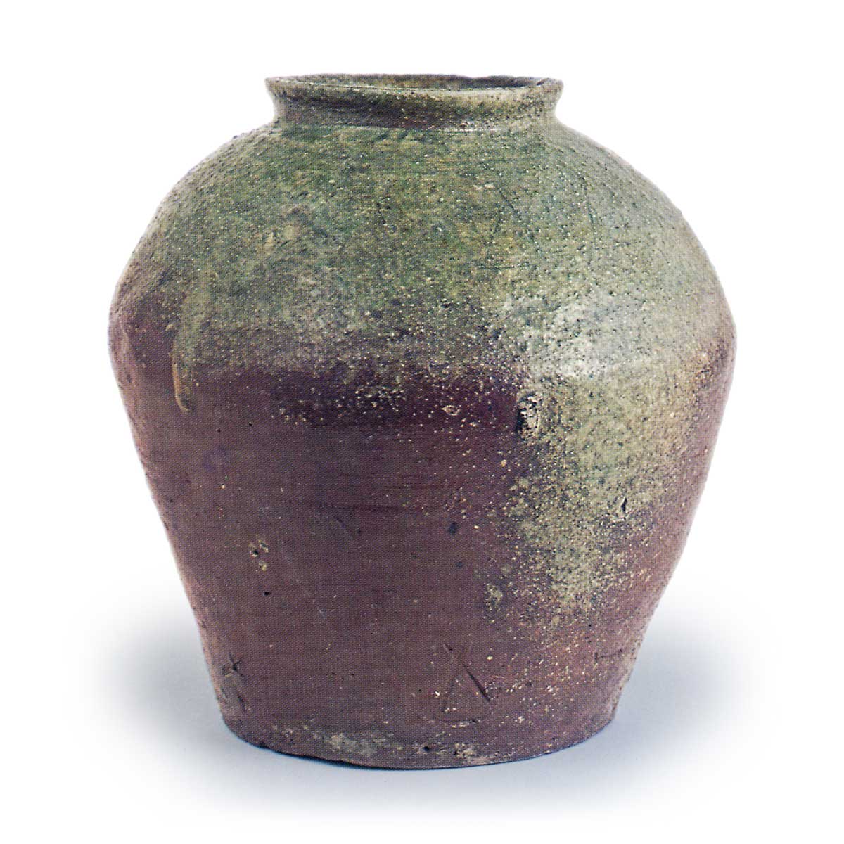 丹波 短颈壶 信楽備前丹波丹波 短颈壶 2025.07.02 丹波 短颈壶 14世纪高度25.8厘米 口径11.5厘米 胴径26.3厘米 底径15.0厘米京都民艺馆该壶呈算盘珠形,短颈从中部略微向外张开。应为镰仓末期至南北朝时期的作品。这是丹波古陶中极为罕见的精品。采用含大量石英细粒的优质陶土,以绳土卷成型,肩部两处、胴体下半部一处以篾描刻有“X”形纹饰。烧制紧密,呈茶褐色,肩部覆有浓绿色自然釉。