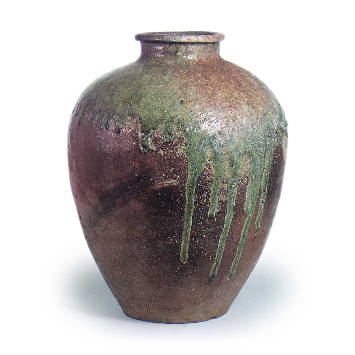丹波 壶 信楽備前丹波丹波 壶 2025.07.02 丹波 壶 15世纪高度45.5厘米,口径14.4厘米,胴径35.5厘米,底径17.5厘米属于长壶系列。口缘部向外扭曲形成带有圆润感的绿色带,但下缘水平且未形成玉缘。口颈部与肩部的连接处呈现出柔和的曲线。采用绳土卷起成型,造型端庄。烧制效果极佳,器身呈黑褐色,表面覆盖着浓绿色的自然釉,数条釉流向壶身,形成独特的纹饰。