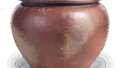 丹波的大瓮在16世纪进入一个新的发展阶段,逐渐演变为低背浅瓮的形态。口沿的折返部分变得水平,厚度增加并形成边缘带。采用绳土卷起成型技法,肩部刻有“久左卫门”的铭文。烧制效果良好,茶褐色的器身肩部覆盖着一层薄薄的黄绿色自然釉。这件作品应为16世纪末期的作品。