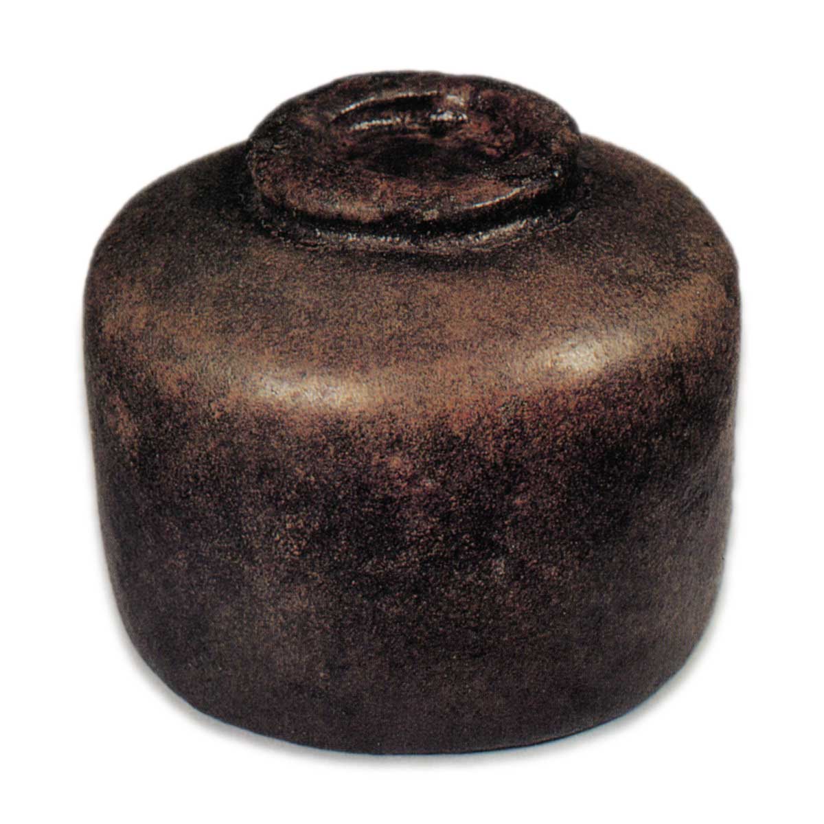 表千家 内盒盖面有山田宗偏题写“长次郎烧 黑茶碗 禿”,背面啼啄斎题写“利休所持 禿 件翁(花押)”,记载为利休所藏。但传世经过利休之后一段时间尚不明确,曾传于山田宗偏,坂本周斎(闲事庵宗信)之后传入不疑庵,随后作为第一件珍宝流传下来。口传中称,利休因常年爱玩此碗而命名为“秃”。《乐烧名物茶碗集》记载:“秃 长次郎黑 坂本周斎 利休所藏,后由宗偏持有,底部有缺口。”据说此茶碗自古以来就存在一个重大缺陷,即从高台到底部有缺口。然而,这件茶碗仍具有强大的力量感,造型自然流畅。尤其是高台部分,宽阔的踏面呈三日月形,结构坚固。腰部轮廓分明,向□部逐渐收窄后挺拔而立,器身略显紧凑,口部内收。宽阔的内壁设有茶洼,内侧带有收缩痕迹,褐色斑驳的黑色釉面相对平滑,但缺乏光泽。高台处留有三处烧痕,整体风格与“まこも”相似。