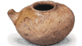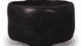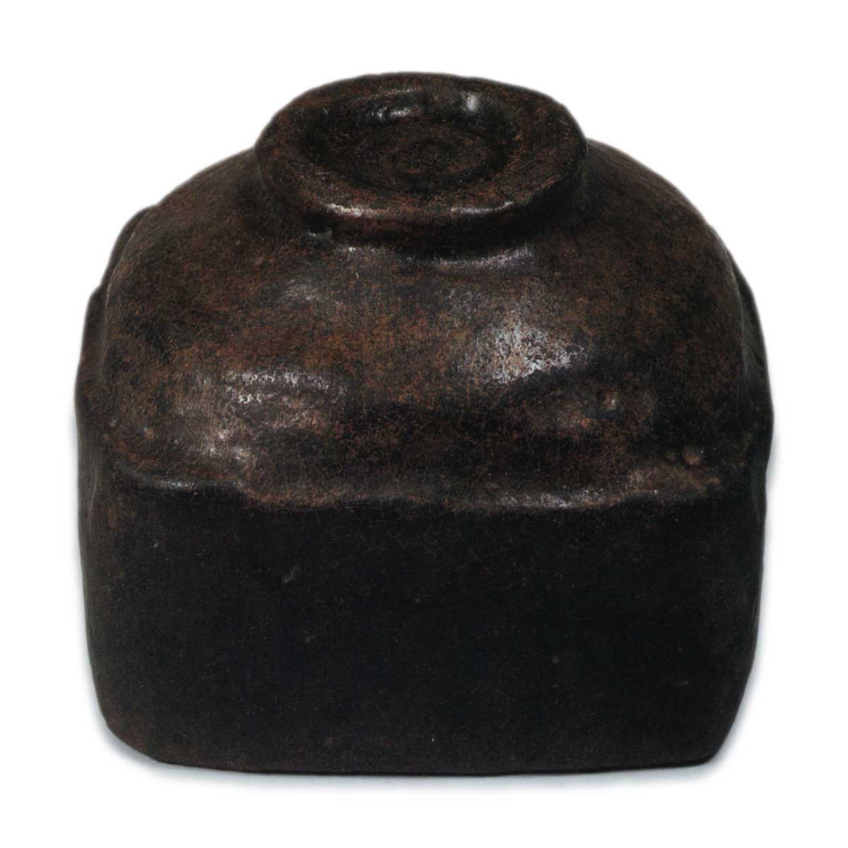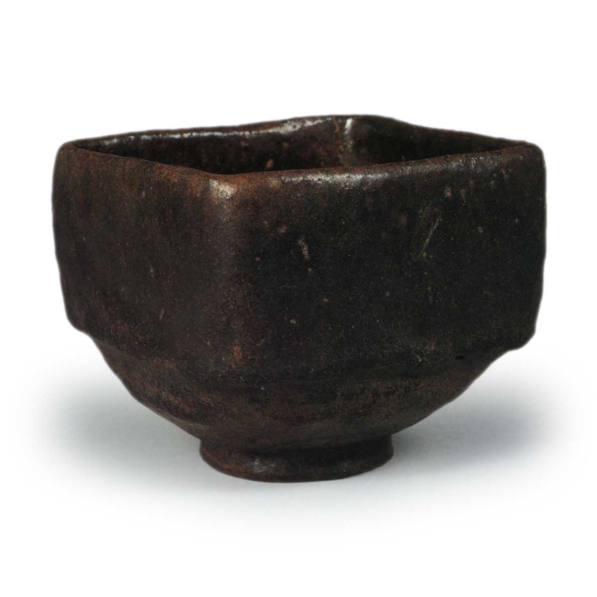 在长次郎烧中,这种四方的茶碗实属罕见。然而,其褐色调的黑色柚木质感、拉坯时的夹痕、口部造型以及高台等细节,与“大黑”的制作风格较为相似。外盒盖内侧刻有“利休好长次郎烧四方黑茶碗”,盖表侧刻有“四方 长次郎作 利休所持”,可见此碗为利休所钟爱。尽管利休偏好自然随意的形态,但方形却是其喜好之一,与利休喜爱的四方釜有某种共通性。虽为四方变形,但整体作风温和自然,充满朴素之美。由于胴部呈四方形,腰部形成阶梯状,但从腰部到高台部分与圆形茶碗的制作手法一致,高台部分带有圆润感,高台内的兜巾以涡状方式温和地削出,与“大黑”相同,高台周围环绕着浅沟。内侧因采用四方造型,四隅留有类似峻轍目般的指痕痕迹。柚皮厚实,四方外侧可见幕柚纹样。褐色黑釉呈现斑驳朦胧的变化,随处可见大小气泡,高台叠接处留有五处指痕。