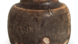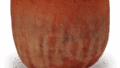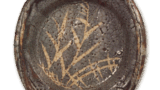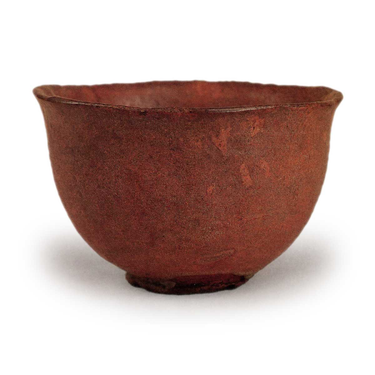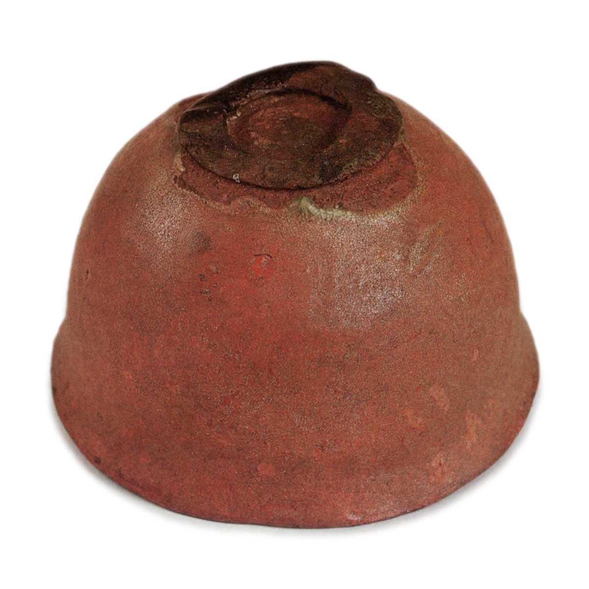 在长次郎烧的茶碗中,其形态极为罕见,制作风格与高丽茶碗的熊川风格相近。因其模仿手挫ねで較櫨びきの茶碗造型等特征,推测可能为宗易形茶碗的先驱作品。我曾推测此茶碗或许就是天正八年千利休在茶会中使用的“ハタノソリタル茶碗”,但目前尚无确凿证据。仅从茶碗的形态和高台的制作手法来看,显得极为质朴,土味和釉色与天正二年铭的“狮子瓦”(图90)极为相似,因此推测可能是长次郎烧的古作,并将其归为“ハタノソリタル茶碗”。茶碗外侧边缘至高台处不规则堆积的柚子釉质感,是后世赤茶碗所没有的随意风格,尤其是高台的制作也完全未形式化。