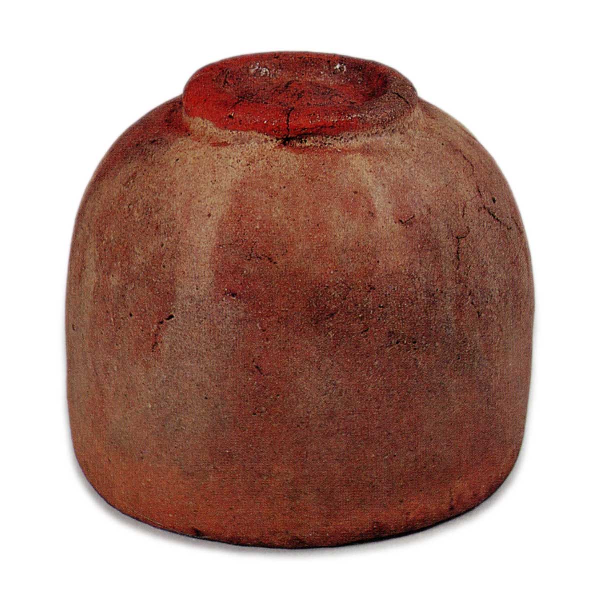 土味、柚皮、高台等细节与“一文字”“无一物”系列作品一致,可视为长次郎烧赤茶碗中具有古朴格调的代表作。然而,此茶碗的器形与其他两件差异显著,腰部圆润、体积稍小,造型极为质朴可爱。但与“无一物”相似,底厚,高台内有缓和的兜巾形凹槽,叠付处留有五个痕迹,釉层比“无一物”更厚,呈现与“一文字”相似的白色釉面,部分区域有薄绿色火变。此茶碗此前鲜为人知,但据记忆曾被收录于《乐烧名物茶碗集》中。