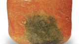 与“一文字”并列为长次郎赤茶碗的代表作,我推测这种器形正是利休所钟爱的典型风格。口部与“大クロ”相似,略微向内收缩,器身饱满圆润,自腰部至高台处缓缓收窄,呈现出无为而化的极致,而“无一物”的铭文想必也与这种意境相呼应。此茶碗的高台相较口径较小,以圆润造型安稳于垫上,高台内侧清晰刻出涡形兜巾纹,其制作手法与“大黑”如出一辙。此外,在长次郎烧茶碗中,此件底部的厚度异常显著,因此手感相当沉重。