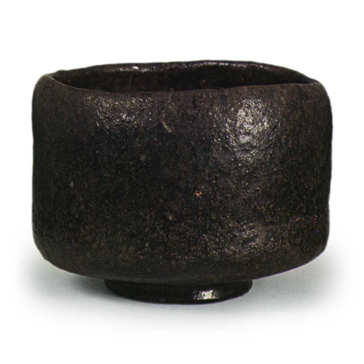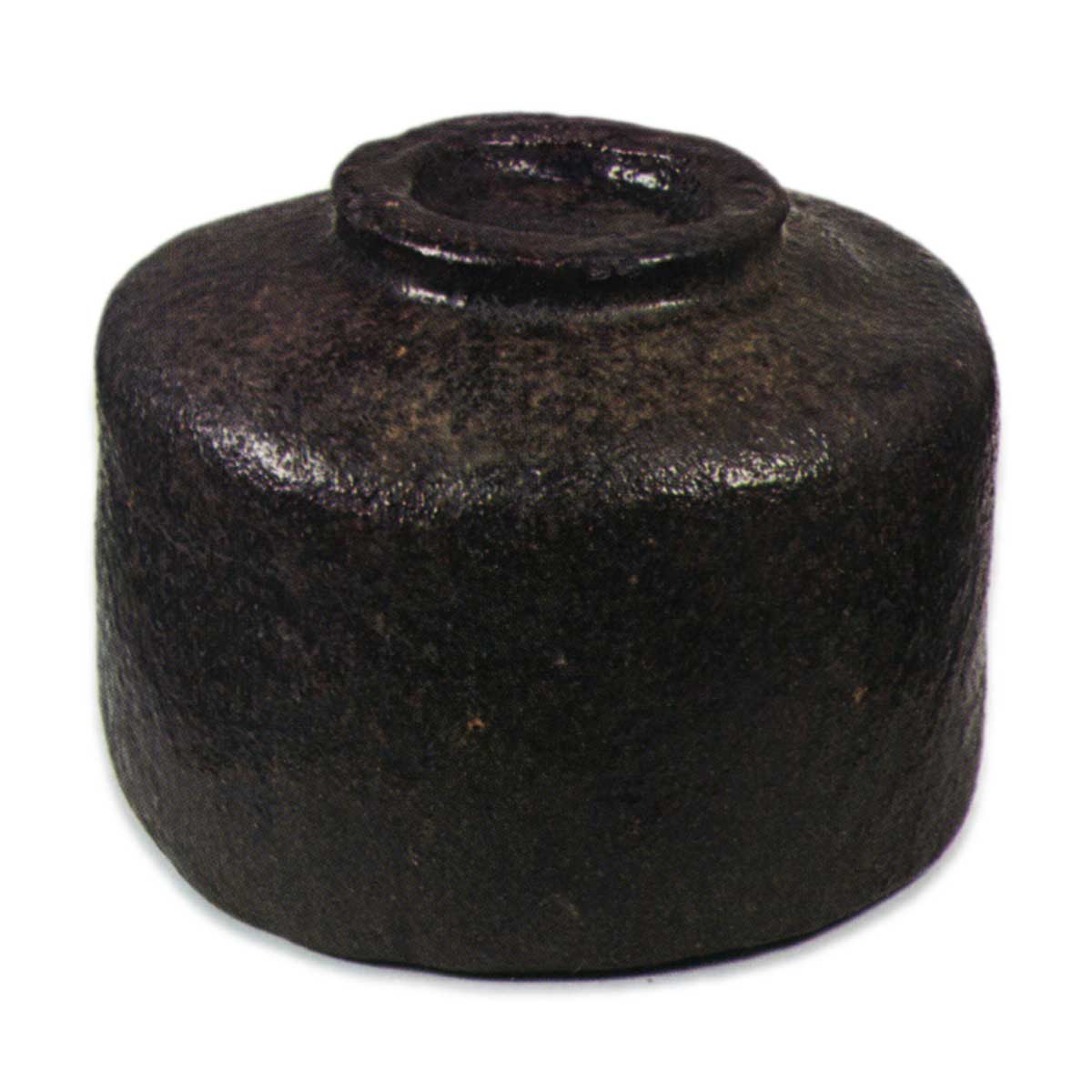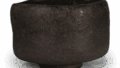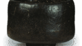 黑茶碗 铭草庵 日本黑茶碗 铭草庵 2025.07.02 黑茶碗 铭草庵 黑茶碗 铭草庵 高度8.2厘米 口径9.6厘米 高台径5.4厘米口缘轻微起伏,同样向内收拢。器身立起稍高,器身中央略微收紧,腰部清晰弯曲。高台略高,底面平坦。高台边缘与腰部之间添加了箆目装饰,高台内侧平坦无兜巾,整体釉面呈粗糙的肤质。内盒缺失一半,残存部分留有宗且的题记“长二郎烧 茶□”。原应为“茶碗”,后世误读“茶”为“草”,补添“庵”字,将铭文改为“草庵”。