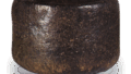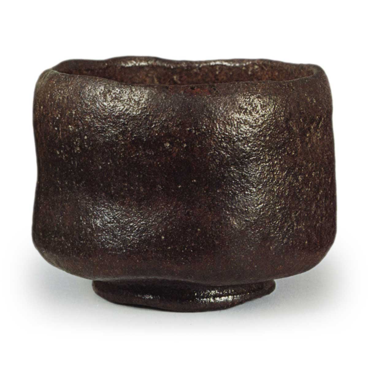 黑茶碗 铭春朝 日本黑茶碗 铭春朝 2025.07.02 黑茶碗 铭春朝 高度8.3厘米 口径9.7厘米 高台径6.3厘米与前图相比,这只茶碗的整体制作风格有较大差异。整体厚实,口沿的制作精细,高低起伏明显,从腰部到高台处起伏更为强烈。高台相对于器形而言较为宽大,尤其是高台的边缘部分宽阔,高台内部平坦。整体涂覆的黑色柚木漆略显粗犷,但质地柔和光滑,带有微弱光泽。高台叠脚处留有两处粘接痕迹。该茶碗收纳于漆器曲物中,盖面刻有宗旦所书“长次郎烧 春朝(花押)”。