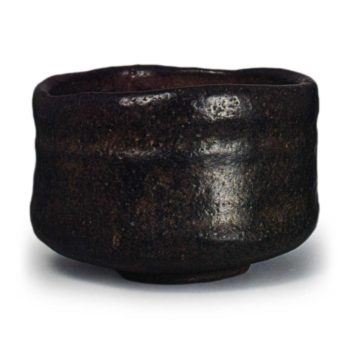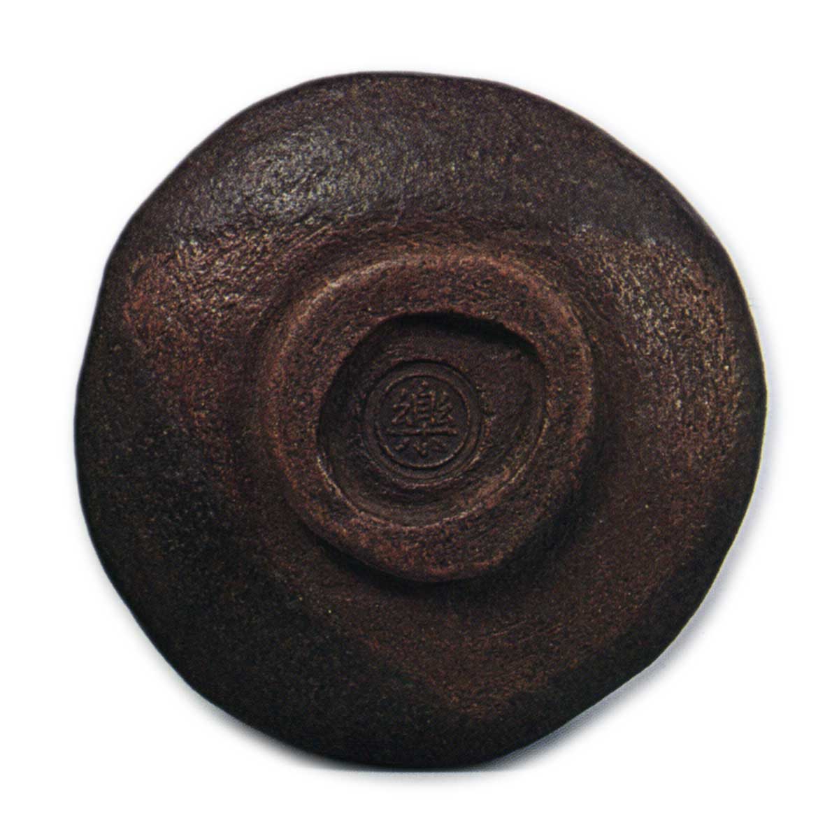 与之前展示的茶碗相比,这款茶碗的制作工艺有显著差异。整体厚实,碗身呈椭圆形扭曲,口部没有包裹感,反而向外微微反卷。碗身中部有一圈类似腰带的凹槽,内壁设有较大的茶水槽。高台也带有志野或织部风格的扭曲,以高台中央为基点形成三角形露土,这与美浓茶碗的制作手法相通。釉面呈褐色,但釉质融化良好。高台内有与“天下一田中宗庆作”雕铭的“三彩狮子香炉”(图91)相同的乐印,但由于无法确定此印是宗庆的专用印章还是长次郎烧的通用印章,因此无法断定此茶碗为宗庆作品。然而,此茶碗的乐印较传为宗庆所作作品上的印稍大,