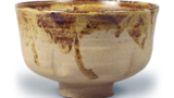 黑茶碗,铭志为栗 日本黑茶碗,铭志为栗 2025.07.02 黑茶碗,铭志为栗 黑茶碗,铭志为栗 高度8.3厘米,口径9.7厘米,高台径5.1厘米汤木美术馆此茶碗高台内中央亦压有乐字印。由于柚皮较厚,与前图所示印章是否相同,或是被称为常庆印的印章,尚无法明确辨认。制作风格与图43的“次郎坊”相似,口部略微向内收拢,整体风格温和,属于所谓的利休形。内壁设有台阶,见地处附有小型茶溜,整体釉色带褐色,釉面融化良好,略带光泽。内盒盖内侧题有“第二代黑茶碗,铭志为栗,左(花押)”,由如心斎题写。此处将高台内压印的印章判定为常庆印,故标注为“第二代”。