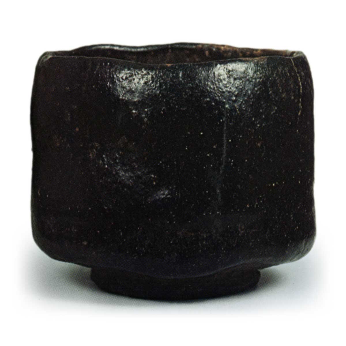 黑茶碗 铭四海 日本黑茶碗 铭四海 2025.07.02 黑茶碗 铭四海 高度8.5厘米 口径9.0厘米 高台径5.9厘米口部向内收缩,口缘带有缓和的起伏,是一款小巧的筒形茶碗。高台相对于器形较大,底座宽广。高台内部宽敞,其内宗旦以朱漆书写了花押。碗内侧半圆形的茶溜清晰可见,高台垫脚处留有三处痕迹。整体釉层较厚,呈深黑色,但釉面带有柔和的光泽。茶碗收纳于溜涂曲木内盒中,盖内侧贴有宗旦书写的“四海且”纸片。