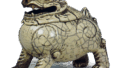 与前图相同的唐狮造型,但尺寸较小。整体覆盖黑色釉面,其上施以金彩装饰,但大部分已剥落。胸前捺有“乐”字印,腹部雕有“天下一”字样。该“乐”字印与宗庆所作狮子香炉上的印章不同,被称为“常庆印”,属于稍小尺寸的印章。