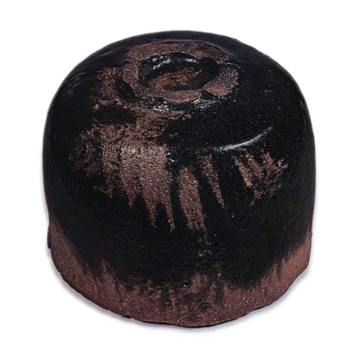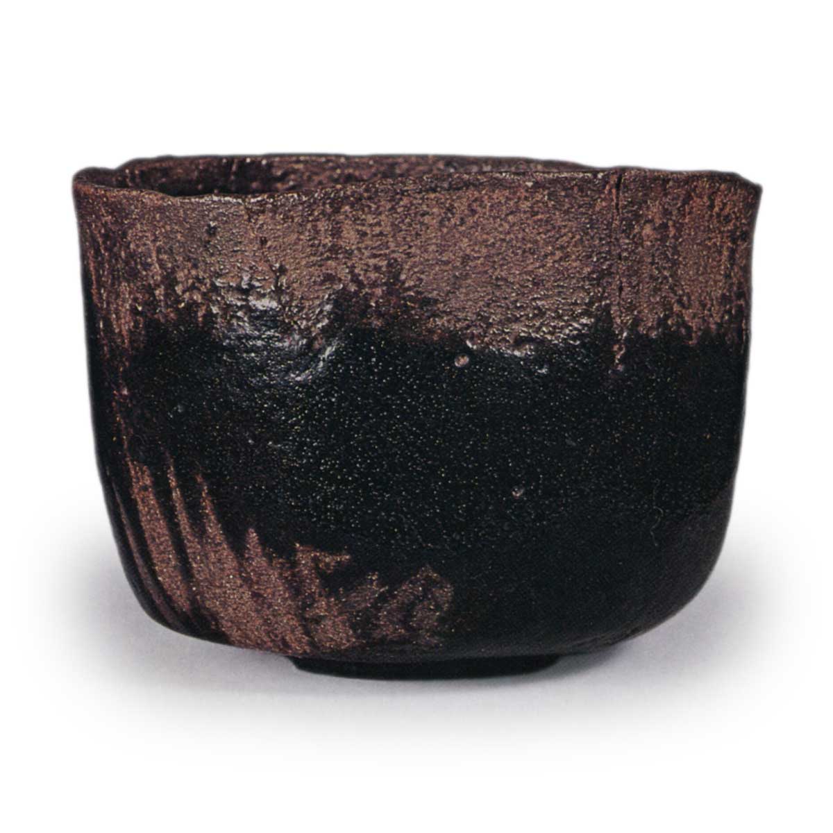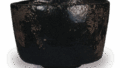 内盒盖内侧有觉觉斎原叟题写:“光悦黑茶碗 铭:雨云 左(花押)”。与“时雨”并列为光悦黑茶碗的代表作。造型与“时雨”相同,高台极低,腰部圆润凸出,从腰部到口部几乎呈直线垂直上升,但器身略微膨胀,部分口部收紧。“时雨”的高台虽低但呈圆润削出,而此茶碗几乎呈棋盘底状,仅略微抬高,高台内侧浅圆削入,叠付处留有不规则的五个痕迹。碗口边缘略微向外反卷,口缘平直锐利,这种处理在手握茶碗中是光悦的独特风格。碗口边缘薄厚不均,高低起伏自然,该茶碗的口部造型尤为突出。