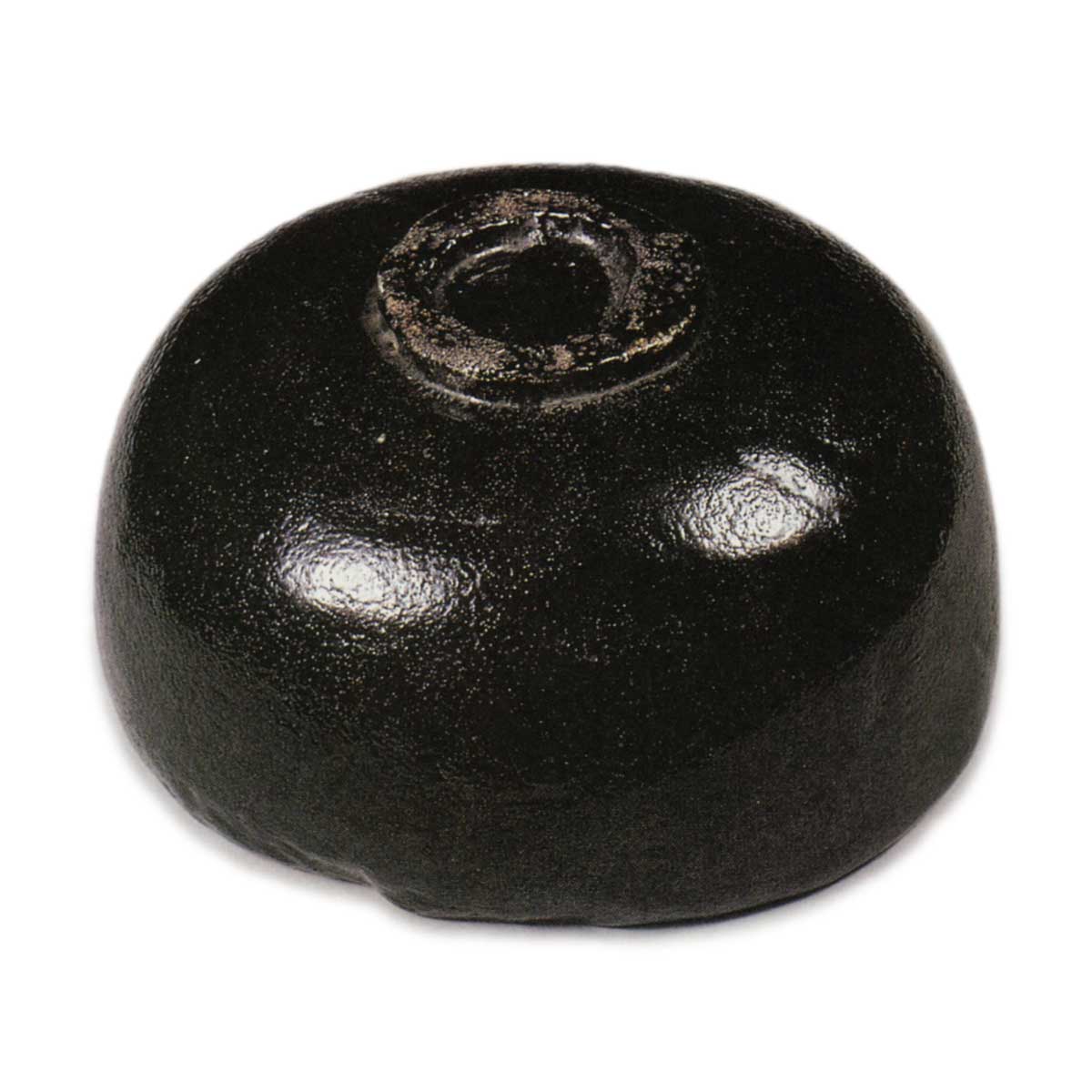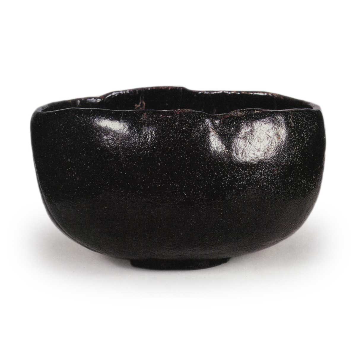 碗身向内收缩,呈楔形,口缘不规则地鼓起,腰部至高台处的圆润感十足,高台略显小巧。垫脚平坦,虽不明显但留有五个痕迹。口缘如常平整,但口部有两处错位,此处应为铭文所在。内壁无茶渍,宽敞舒展,其制作风格与ノンコウ极为相似。推测ノンコウ可能受到光悦的影响。整体涂抹的柚木漆光泽深邃,釉面如柚皮般烧制,釉色与ノンコウ黑完全相同,应使用ノンコウ传的釉料并在其窑中烧制而成。曾为益田鈍翁旧藏。