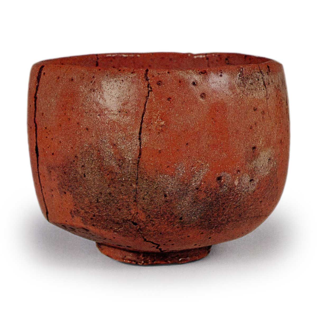 此外,高台的踏面留有大小不一的白色痕迹。陶土采用赤土,釉面一处融化良好,另一处如薄雾般泛白,边缘则呈现薄墨状的火变效果。窑疵从口部延伸至器身及高台周围,呈现多条纹路,这也是光悦的特色之一。釉面布满大小不一的气泡孔。