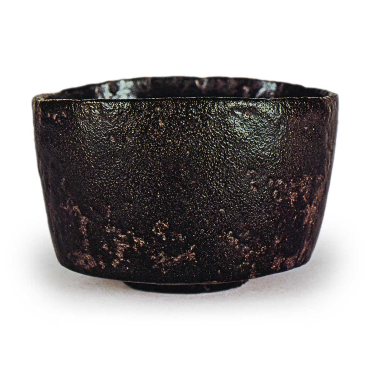 高台低矮,圆形轮廓清晰,台面平坦。高台内侧的削痕与“七里”或“加贺光悦”极为相似,是光悦手工艺特点最为突出的部分。整体上涂有与“雨云”或“七里”同质的非釉黑釉,但随处可见火痕,露出铁色的烧制土质。高台垫脚处留有五个凹痕,内壁与“七里”、“雨云”或“不二山”相同,略带圆润但基本平坦。素朴的箱形内盖背面题有“遵本阿弥氏当院捐赠传世之物 明和初年二月 紫野独庵识”字样。独庵是明和年间居住于德禅寺的僧人。因此,推测此茶碗为本阿弥家捐赠给德禅寺的器物。
