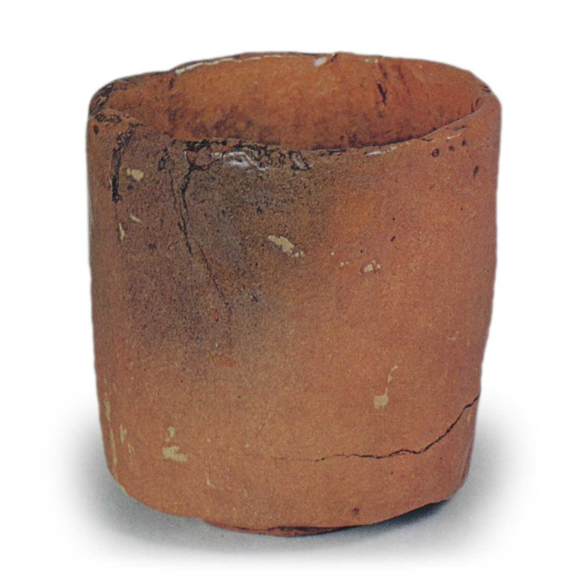这是一款小巧而洒脱的茶碗,腰部笔直,高台较低,从腰部到口部呈直线状微微张开。口部厚薄变化明显,口缘起伏有致,平滑地用筅子刮过。高台呈不规则椭圆形,颇具趣味,略微偏向一侧,高台内的削痕较深。从口缘至器身布满纵向篾痕,与光悦茶碗其他作品相比,显得更为随意粗犷,削制手法接近其孙空中的风格。釉面融和,呈带黄的檀色近似赤茶碗,口部至器身部分有部分火变。“雪片”的铭文,源于红色釉中点缀着片片白色飞釉,这种景色为茶碗增添了飘洒的气息。口边和胴部有纵横的窑疵。