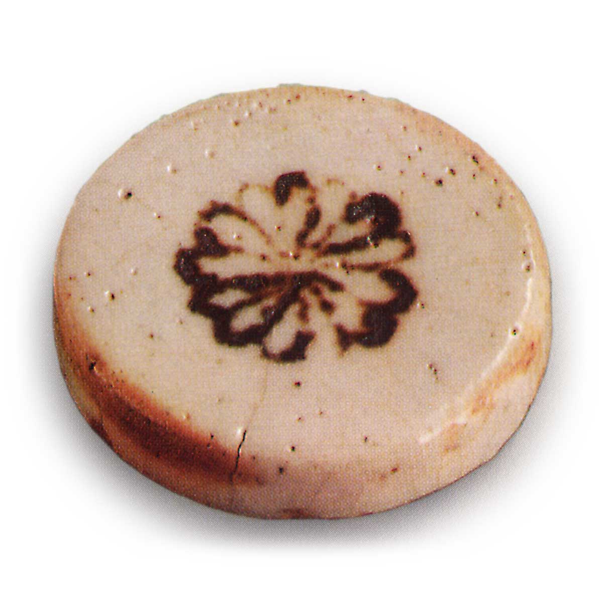 志野菊纹一字香合 志野志野菊纹一字香合 2025.07.03 志野菊纹一字香合 志野菊纹一字香合 志野菊纹一字香合 高度3.8厘米 口径5.6厘米 底径3.2厘米与“万年青香合”并列为志野一文字香合的双璧之作。形式完全相同,盖面中央清晰描绘着十三瓣菊花纹,气品高雅。除身部立起部分外,整体覆盖的白色釉层比“万年青香合”更厚,雪般洁白的釉面柔和细腻,红色焦痕格外鲜艳。与“万年青香合”一同被归为大萱牟田洞窑或窑下窑的作品。