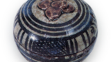 志野香合 志野志野香合 2025.07.03 志野香合 志野香合 志野香合 高度 5.1厘米 口径3.6厘米 底径3.4厘米呈敦实厚重的饼形香合,盖面中央隆起形成平坦的凸起,底部附有低矮的小轮高台。盖面至器身饰有浓郁清晰的篱笆与树木纹样,除盖口与器身接合处外,整体覆盖的白色釉料融化均匀,底部的红色焦痕鲜艳夺目。这种敦实造型的香合与“茄子香合”并列为最杰出的作品。两者均推定出自大萓的牟田洞窑或中窑。