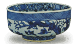 釉色呈红枇杷色,透过爱陶器特有的青绿色釉色可以看到。有些地方釉色不均匀或脱落,从碗腰向下延伸到足环边缘的唐草纹(一种图案)特别漂亮,带有淡淡的蓝色。这是茶碗的第一个亮点。