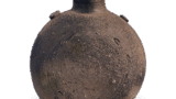 志野矢筈口水指 志野志野矢筈口水指 2025.07.032025.11.14 志野矢筈口水指 高度17.4厘米 口径18.0厘米 底径18.5厘米万野美术馆矢筈口造型有力,整体厚重,具有丰富的体积感。平底采用线切工艺,胴部下缘饰有箆目纹。胴部绘有檜垣与树木的远山风景,但绘画较为淡薄,细节不易辨认。志野釉覆盖均匀,釉层虽略薄但熔融良好,火色鲜艳。原配盖是否为原物尚不明确,但附带盖子实属罕见。然而盖面釉面已严重剥落。整体造型虽不张扬,但沉稳厚重,是一件风格稳重的水指。原为益田鈍翁旧藏品。