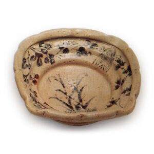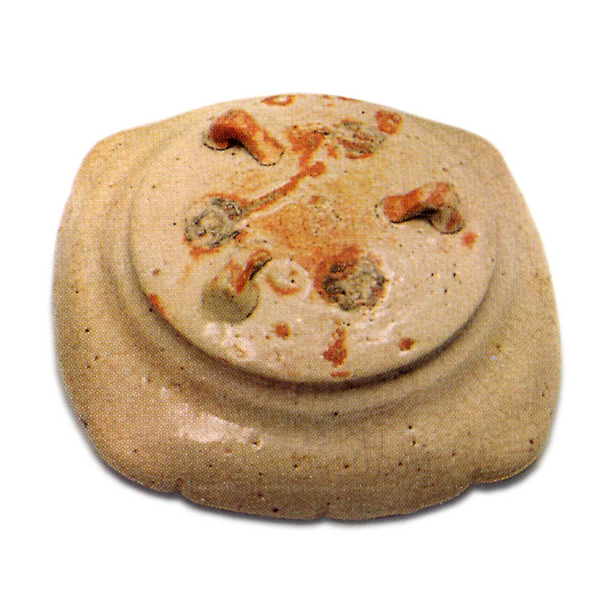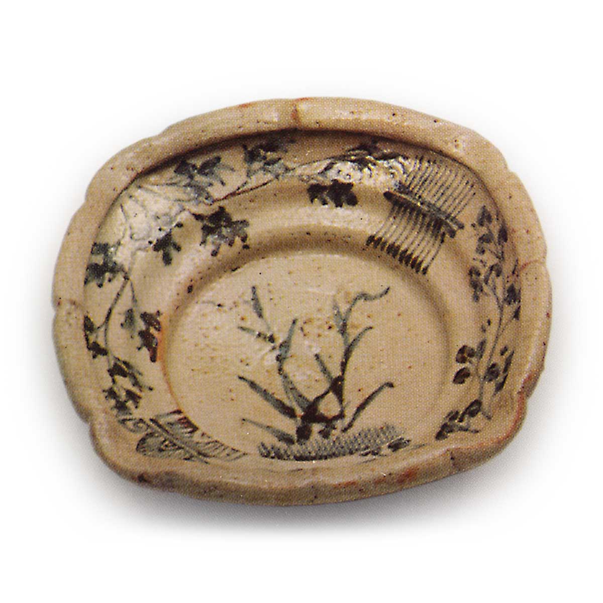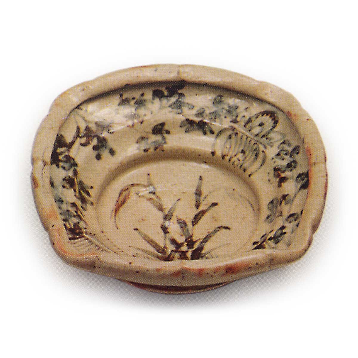 志野芦文向付 志野志野芦文向付 X Facebook Hatena Bookmark LINE Pinterest 复制 2025.07.04 志野芦文向付 志野芦文向付 志野芦文向付 高度6.2厘米 口径15.4厘米 三脚抚平四方的平底向付。口部呈鐔状开口,边缘略微上翘,可用手指捏成花形,内壁较深,底部圆润,三面附有脚。此类形状的向付在志野地区较为常见,唐津地区也效仿制作。器物中央绘有两株芦苇图案,边缘以萩花纹样对角排列,其间以柴垣与花瓣纹样同样对角装饰。釉料均匀覆盖整个器物,熔融顺滑,质地柔和,口沿和底部露出红色火色。器物中央的轆轤痕以涡状呈现,底部脚部之间留有三个圆形大痕迹。此类向付堪称最精美之作,五件成套保存完好。