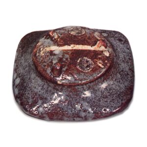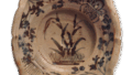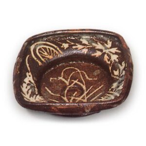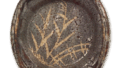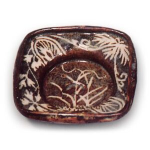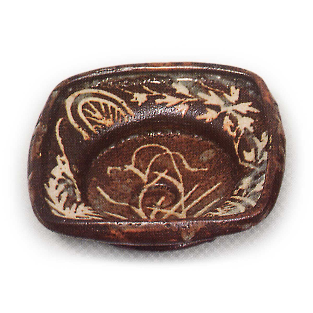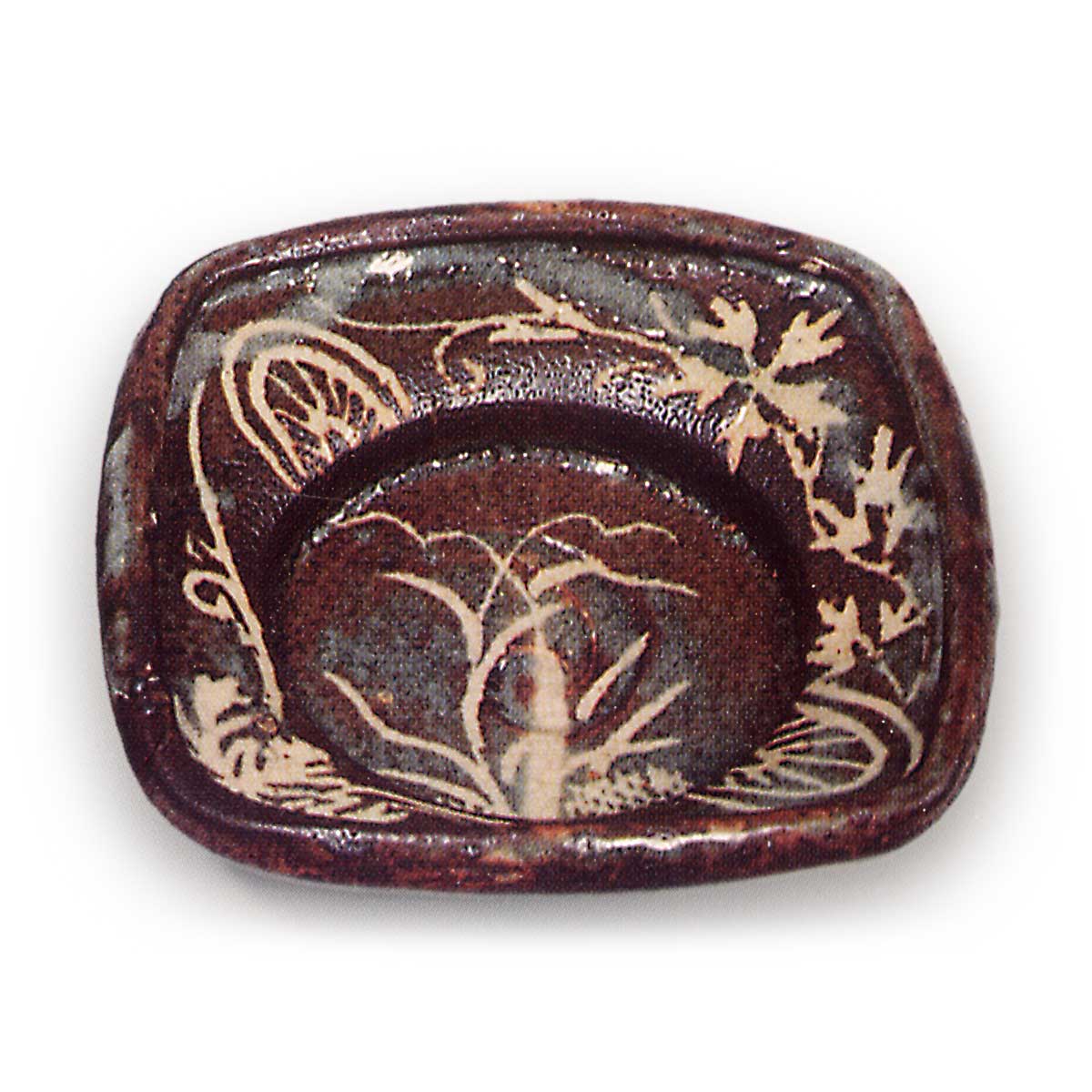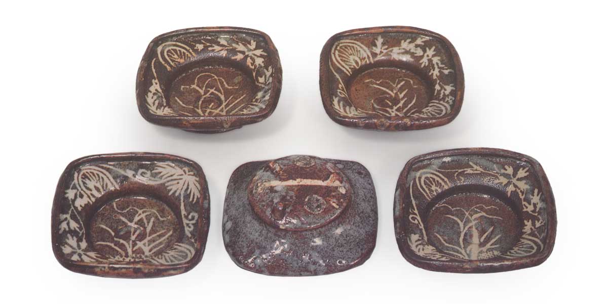 鼠志野芦文向付 志野鼠志野芦文向付 2025.07.04 鼠志野芦文向付 鼠志野芦文向付 高度6.2厘米,口径15.5~16.7厘米,三脚与志野芦文向付相同,为抚平四方的平底向付,但此件口缘向内扭转。这是迄今为止所见鼠志野向付中最精美的作品,且五件成套完整。盘面中央饰有芦苇纹样,边缘则以不同唐草纹样对角排列,其间点缀着同向对角的半轮车与花瓣纹样,均以鼠色为底,白釉清晰显露。整体施釉并非薄透,但其中部分釉面烧成近暗褐色。釉质柔和,烧成效果罕见且优良。内壁中央有涡旋状轆轤纹,圆底三方附脚,脚间留有三处大眼痕,内壁亦残有三处小眼痕。