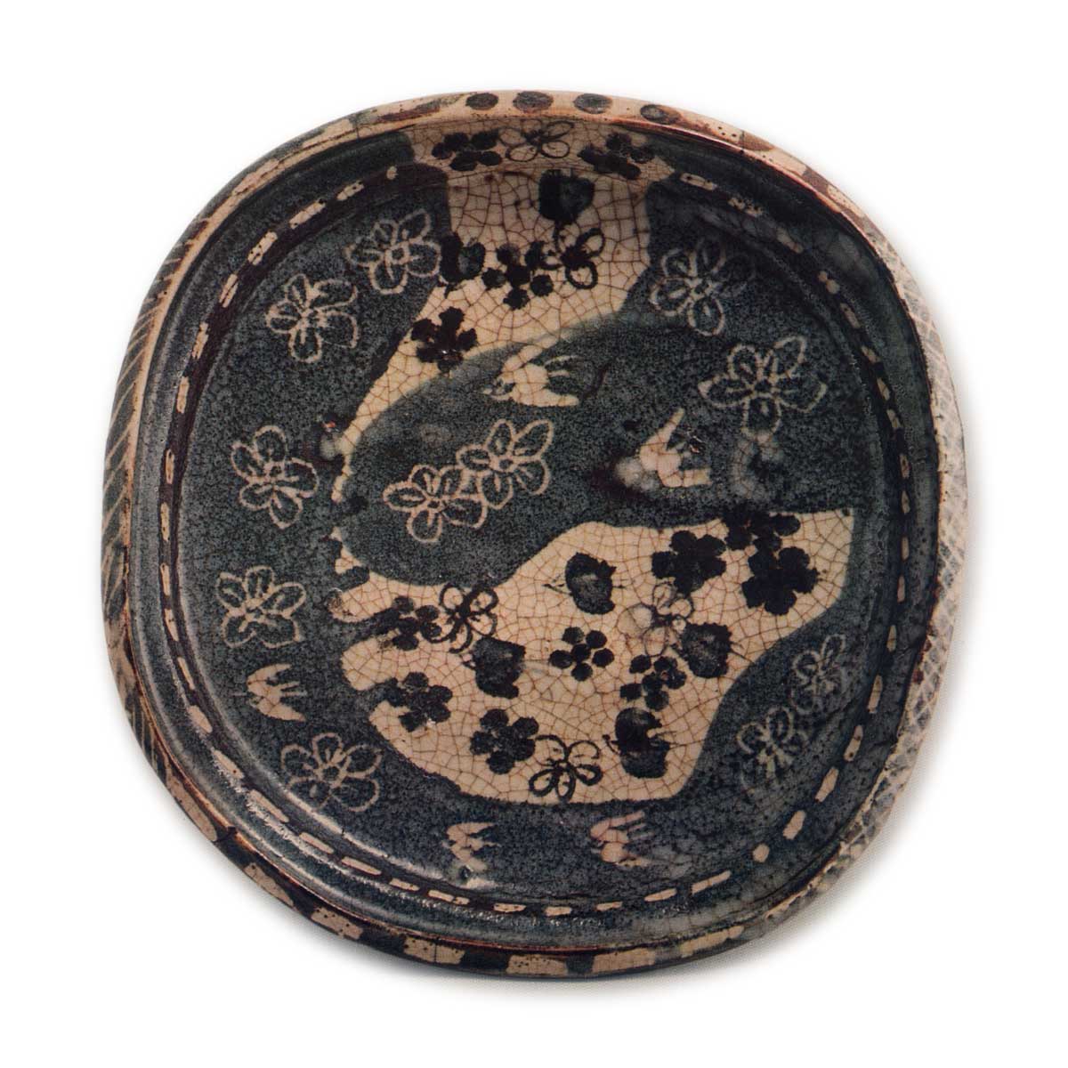 鼠志野花鸟纹平鉢 志野鼠志野花鸟纹平鉢 2025.07.04 鼠志野花鸟纹平鉢 高度7.2厘米 口径26.3厘米 三脚鼠志野莲纹平鉢与形状相似的平鉢,鬼板的装饰似乎是流淌涂抹而成,不规则地留下的白色部分在此处也被巧妙利用,提升了装饰效果。鼠地以白色线雕散落梅花,空间中点缀千鸟,白地绘有梅花与梅鉢纹,并以铁絵具描绘千鸟等,整体虽采用粗犷的构图,却蕴含细腻的考究。口沿以白色点线环绕的细节亦颇具趣味。全器表面厚实光滑地覆盖着白釉,釉面柔和融化,背面中央未施鬼板装饰,露出白色的土质表面。底部三面附有脚,留有四个圆形脚印,器身内侧也各有四个小脚印。