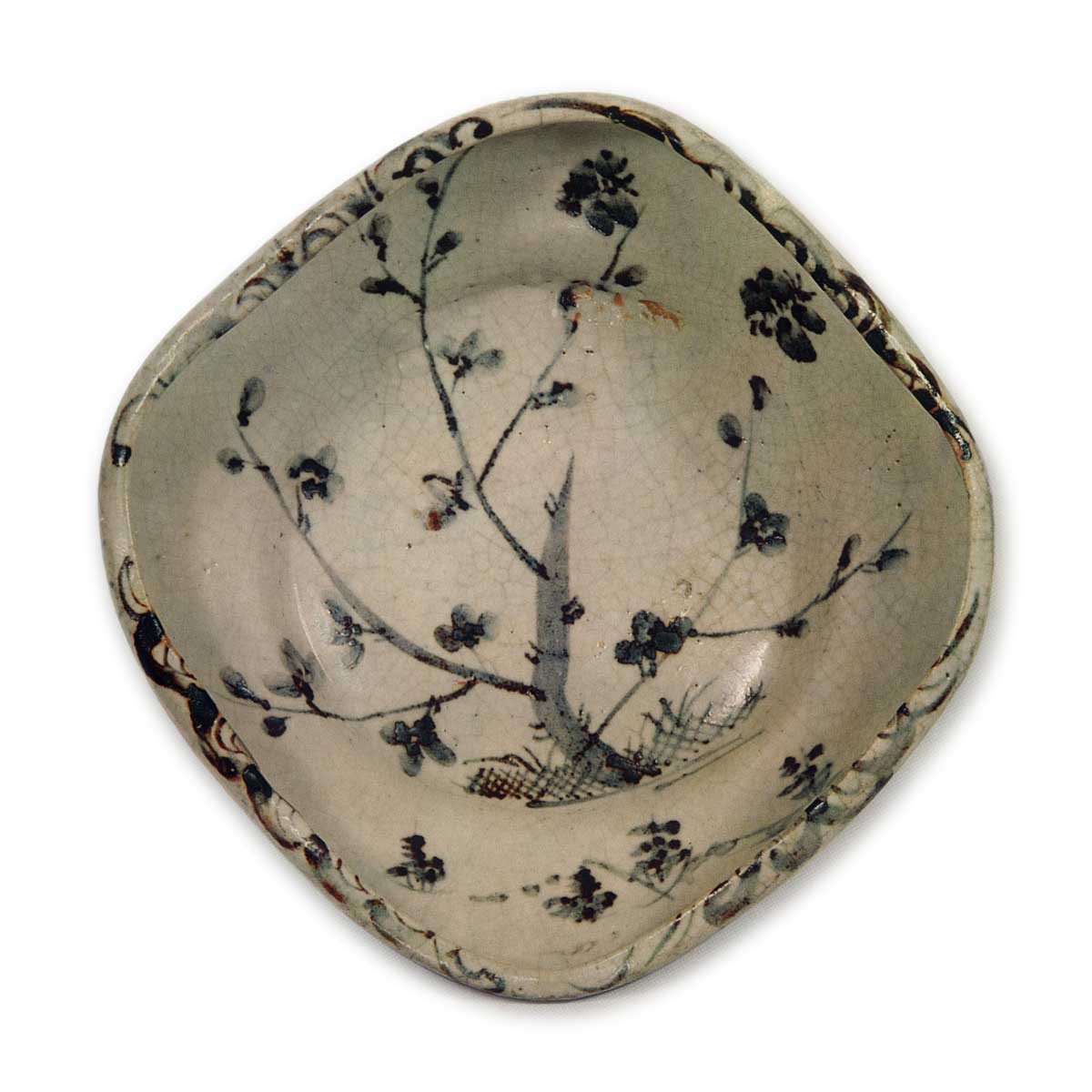 志野梅树纹鉢 志野志野梅树纹鉢 2025.07.04 志野梅树纹鉢 高度9.7厘米 口径26.9厘米 三脚MOA美术馆口部宽敞,深碗设计,口部向内收缩。腰部有阶梯状设计,圆润的碗壁深邃。釉面如融化的雪般洁白,一棵枝叶舒展的梅树栩栩如生地描绘其上。内侧一侧饰有木纹山纹,折返的边缘绘有波纹。梅树乍看之下仿佛桃花。底部三方有脚,脚间有五个圆润粗壮的目痕,内侧有四个小目痕。