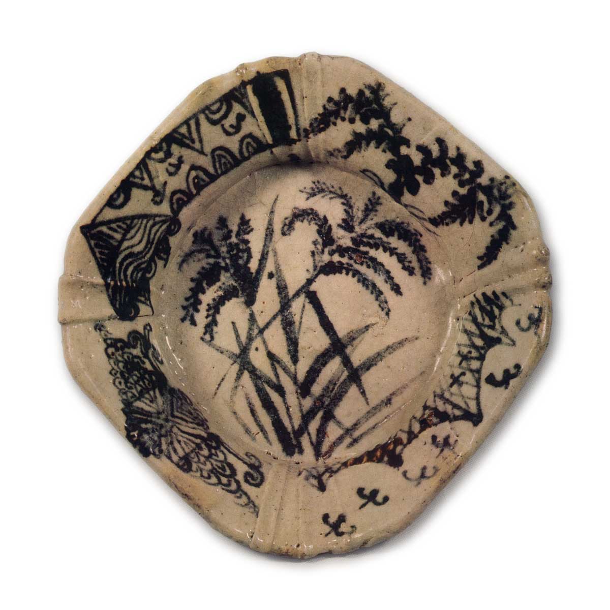 志野草花纹鉢 志野志野草花纹鉢 2025.07.04 志野草花纹鉢 高度8.8厘米,口径29.5厘米,三脚三得利美术馆该花盆边缘宽阔,向外翻卷,内壁深凹,边缘呈抚平状。此外,罕见地于四面各饰有两条粗纹。纹样方面,碗身草花纹样虽简洁,但边缘纹样包括网干纹、千鸟纹、菱花纹及更纱风纹样等,构成有趣的纹样组合。整体制作略厚实,通体施以融和的白釉,红色完全未显露。平底三面附有脚,周围留有五个眼痕。内壁也有三个小眼痕。这很可能是大平或久尻元屋敷窑的作品。
