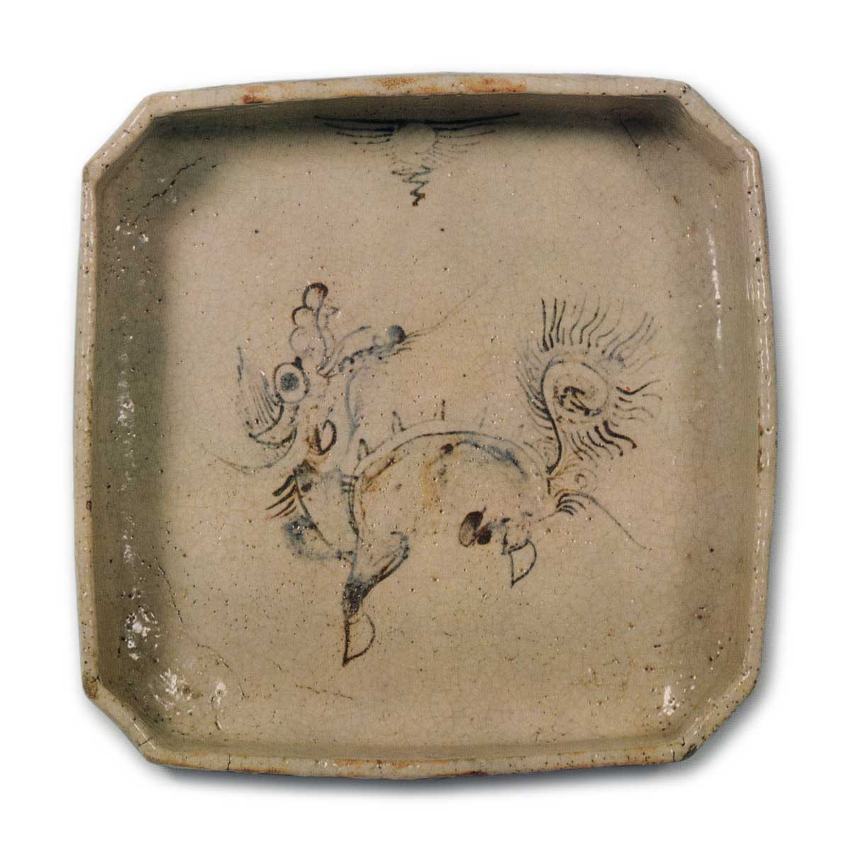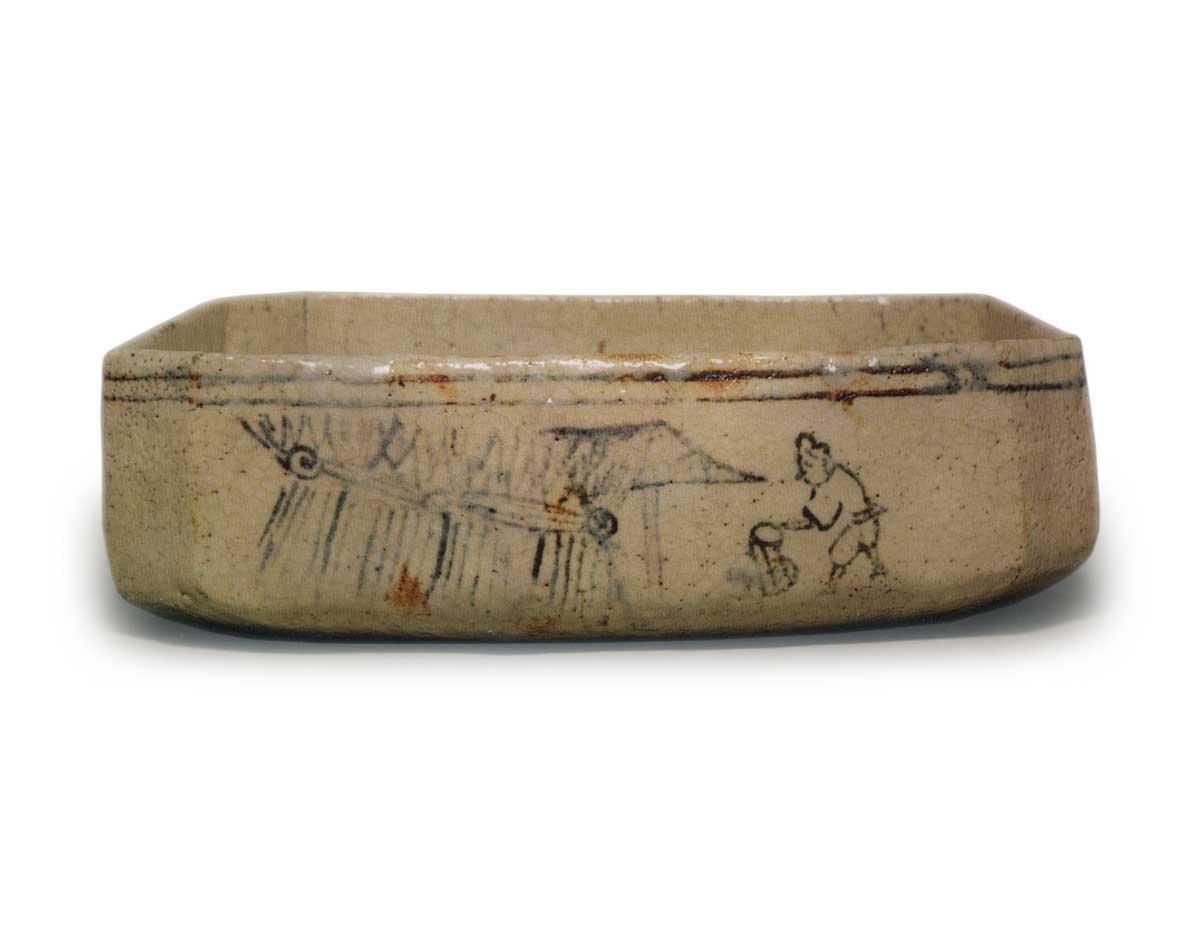 志野麒麟纹鉢 志野志野麒麟纹鉢 X Facebook Hatena Bookmark LINE Pinterest 复制 2025.07.04 志野麒麟纹鉢 志野麒麟纹鉢 高度6.6厘米 口径22.3厘米 底径19.0厘米该碗呈四方隅切形,底部平坦,腰部圆润,底部平底。碗内侧描绘了一头仰望天空日轮的麒麟,笔触细腻而飘逸。碗侧面两侧描绘了柴垣、房屋和人物的图案,另两侧则描绘了树木的图案。这种设计风格的碗在其他作品中尚未见过。然而,我曾见过一件疑似同笔的麒麟纹菊形盘。整体薄施白釉,略带红晕。