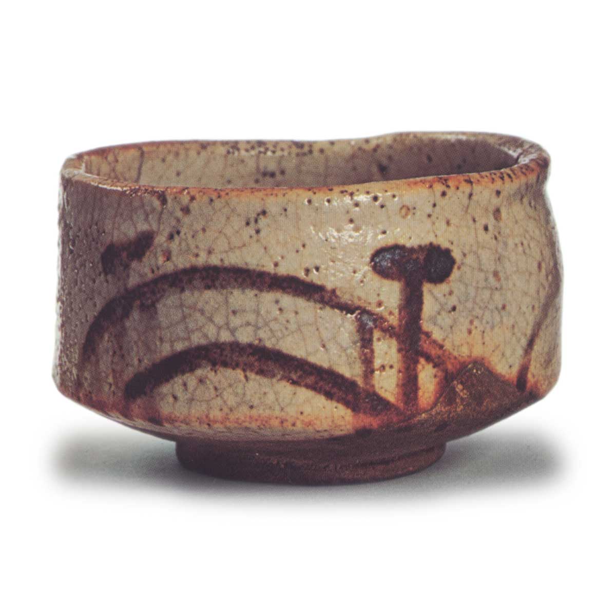 腰部挺拔端庄的半筒形茶碗,与志野桥纹茶碗 铭桥姬或志野馆桥纹茶碗 铭若宫的茶碗相比,其制作形式更为规范。高台旁带有圆润的曲线,这也是与早期茶碗的不同之处。高台底部雕刻环绕,形成所谓的双层高台,高台中央露出大三角形的陶土。碗身绘有桥的图案和历法风格的纹样,并附加了草状纹样。