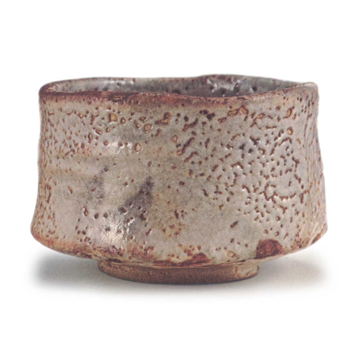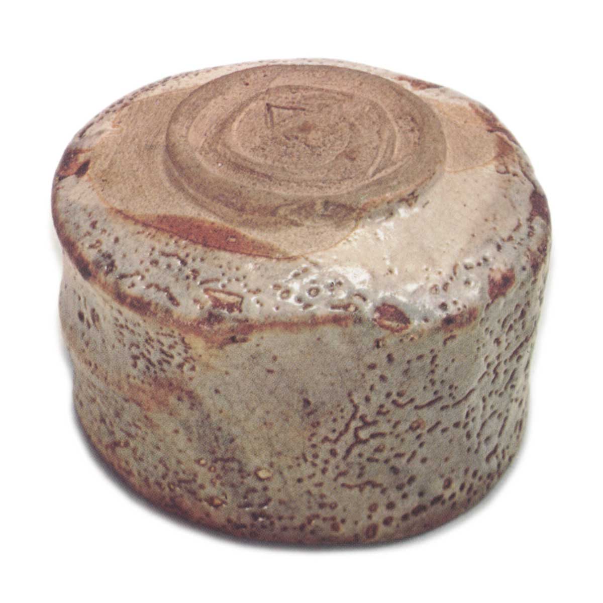 鼠志野茶碗 志野鼠志野茶碗 2025.07.05 鼠志野茶碗 鼠志野茶碗 高度9.0厘米 口径12.5厘米 高台径7.5厘米鼠志野桥纹茶碗与铭力丸极为相似的茶碗,但这种半筒形的鼠志野茶碗与绘志野茶碗相比,同类作品极为罕见。釉下刮去鬼板以显露纹样,但因表面覆盖的长石釉层较厚,纹样不易辨认。底部附有低矮的双高台,高台内以箟雕刻有三角形窑印。