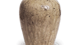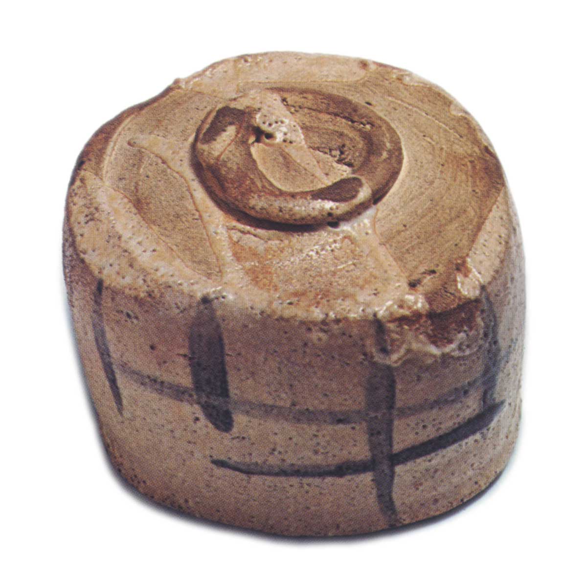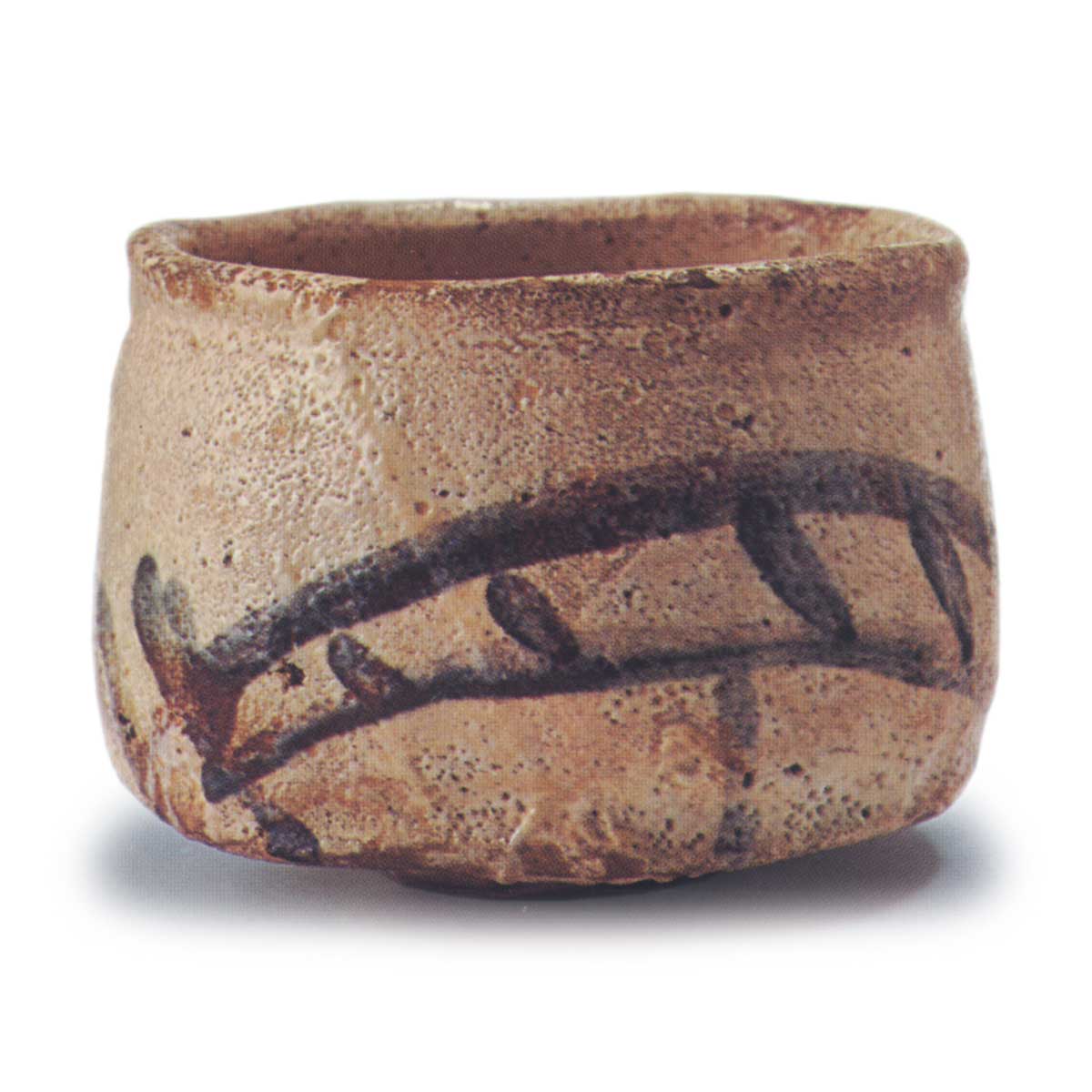 志野桥文茶碗 铭武藏坊 志野志野桥文茶碗 铭武藏坊 2025.07.05 志野桥文茶碗 铭武藏坊 志野桥文茶碗 铭武藏坊 高度10.4厘米 口径13.0厘米 高台径6.1厘米整体呈抚三角形的大型茶碗,碗身膨胀,手捏风格明显。此茶碗外侧一侧绘有桥的图案,另一侧则简笔勾勒出类似篱笆的纹样,笔触有力。釉层较薄且柔和,因此整体呈现出志野釉特有的红润色调。高台明显为附加高台,呈现出将圆形土片压制的粗犷质感。这种看似随意实则精巧的茶碗自何时开始烧制尚不明确,但推测可能出自大平的由右卫门窑。箱盖内侧有藪内竹翁题写“武蔵坊”的铭文。