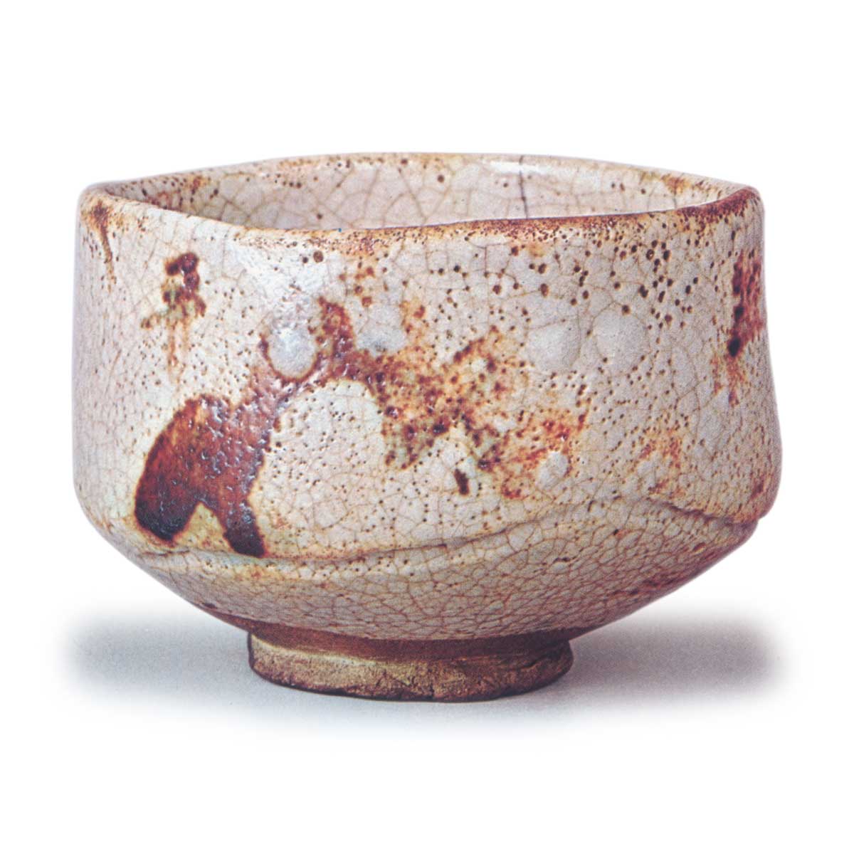 志野山水纹茶碗 铭朝萩 志野志野山水纹茶碗 铭朝萩 2025.07.05 志野山水纹茶碗 铭朝萩 高度9.5厘米 口径12.7厘米 高台径6.0厘米志野山水纹茶碗「朝萩」是曾为松平不昧公所藏的茶碗。作为志野茶碗,其造型颇具匠心,腰部饰有山路状的纹饰,这也是此类茶碗的特色。相较于半筒形茶碗,这款茶碗在工艺上更为精湛,推测属于较晚期的作品。碗身绘有志野绘画中常见的木纹山景,白釉厚重,光泽璀璨,令人联想到露水滋润的白色花朵,因此得名“朝萩”。高台呈三角形扭曲,与变化多端的碗身相呼应。此茶碗曾为松平家所有,后转入团家,现为现藏家收藏。