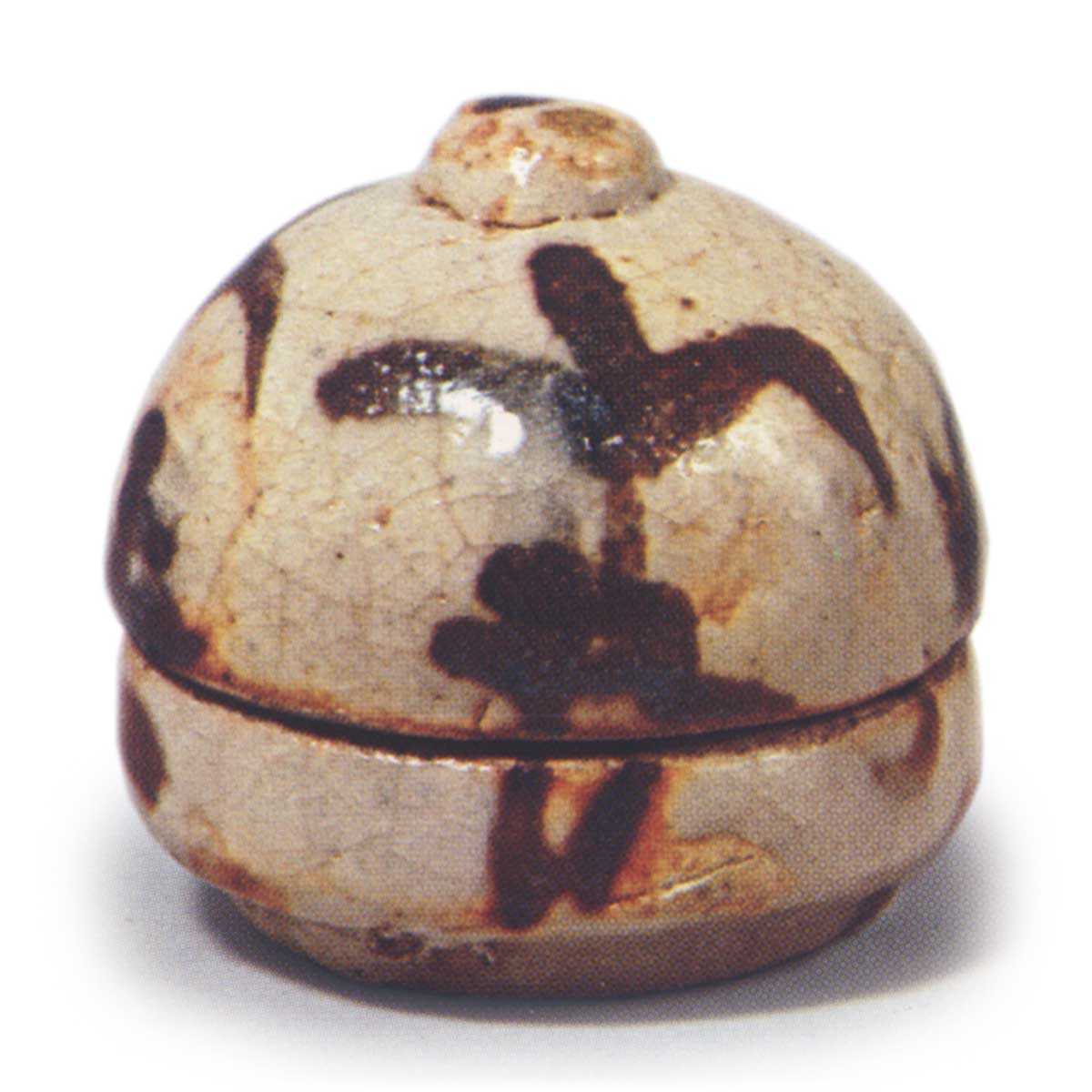 志野蜜柑香合 志野志野蜜柑香合 X Facebook Hatena Bookmark LINE Pinterest 复制 2025.07.05 志野蜜柑香合 高度4.5厘米 口径3.7厘米 底径3.4厘米与前图相同造型,但器身四面饰有草纹图案。此类香合的盖与身合口处均露出陶土,其余部分均施白釉。高台采用粗犷的轮高台,高台两侧留有四个眼痕。